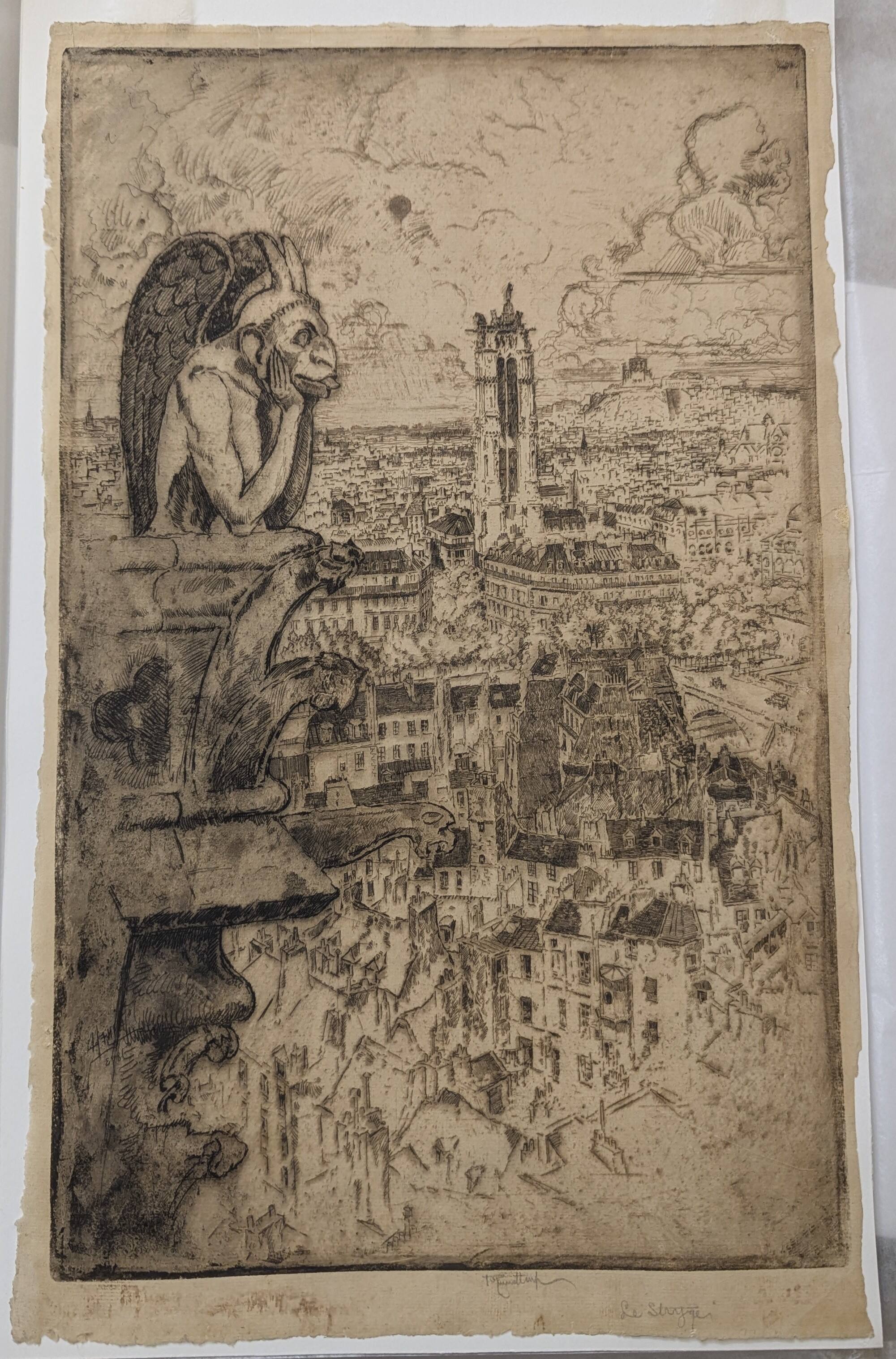 Label TextPennell was in France in 1889, sketching a series of etchings of what he called, “The devils of Notre Dame,” the gargoyles that decorate the cathedral’s façade. Not only can we interpret this character study of the gargoyle as an examination of architecture, but also of unique perspectives, Pennell is viewing the Parisian cityscape as the gargoyles do, from a bird’s eye vantage. The tower of Sainte-Jacques dominates the skyline, drawing attention to the lone hot-air balloon floating above the city, the church of Sacré-Cœur faintly visible in the distance.On View