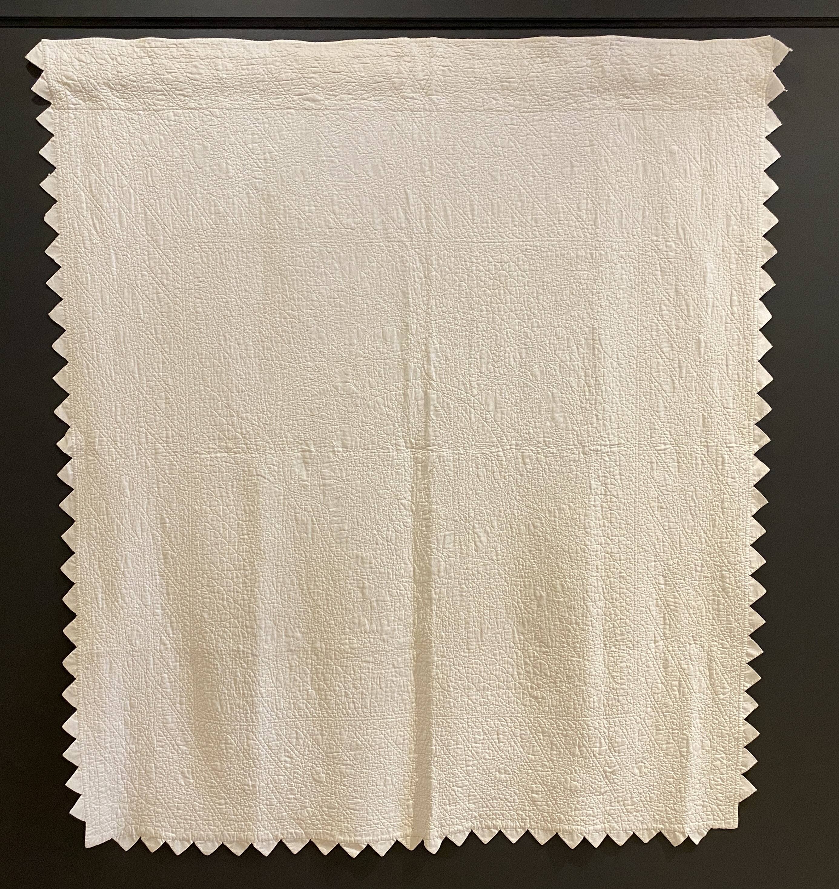 Label TextThe term “quilting” refers specifically to stitching through layers of fabric and batting rather than the piecing of patchworked textiles, and most early American quilts were made with whole-cloth tops. The dense quilting displayed the maker’s skill and artistry, as well as the quality and cleanliness of the fabric used to make the quilt.While eighteenth century quilts were often made of colored silks and wools, in the early nineteenth century, white cotton tops rose in popularity as quilters imitated imported Marseilles machine-woven textiles, themselves imitations of hand-made quilts in less expensive cottons. Designs focused on a central medallion, like this one, also went hand-in-hand with the change in materials.
