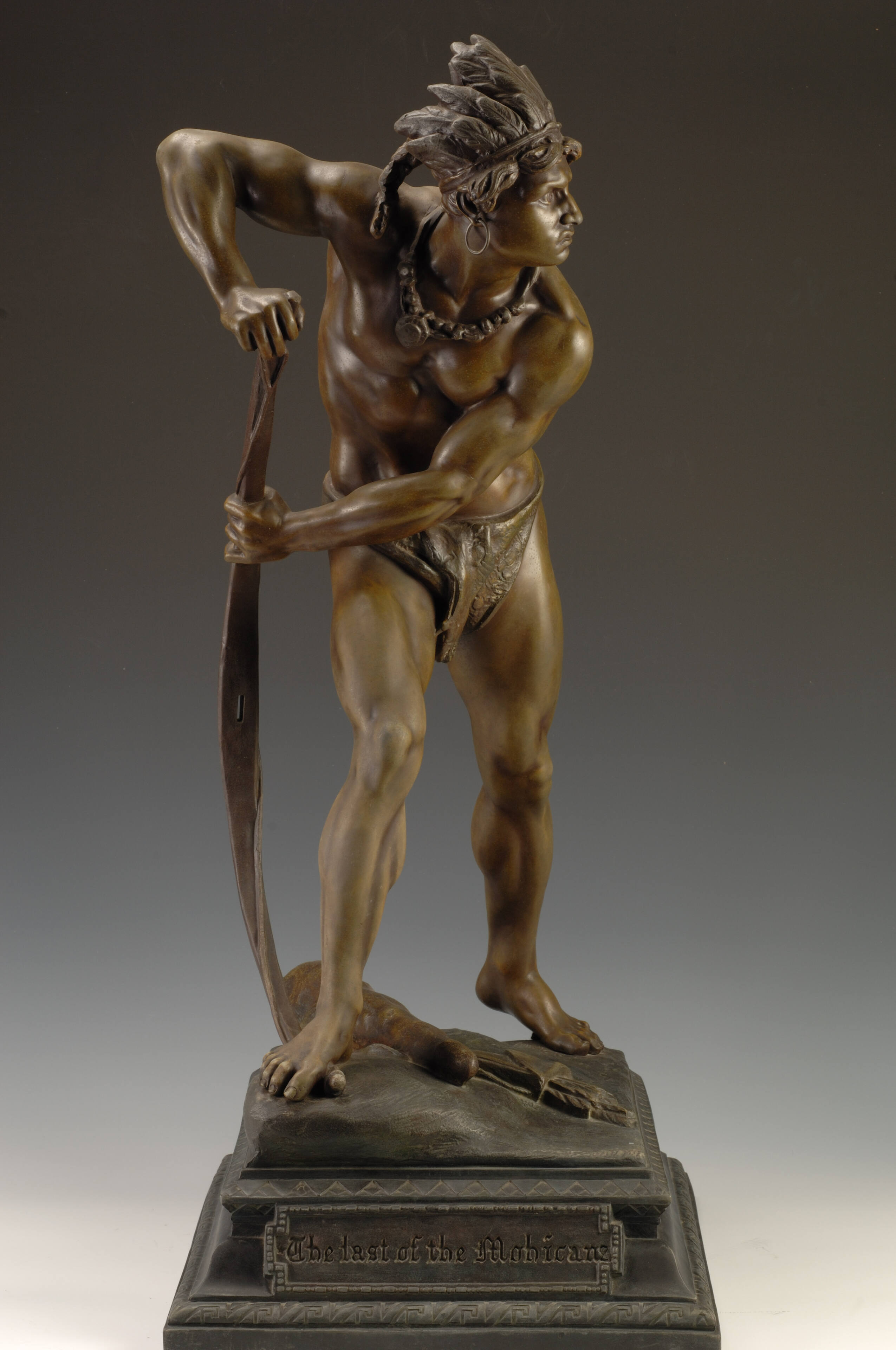 - Figure of an Indian with a bow, club and quiver, wearing loin cloth, headdress and beads; rectangular base with greek key and triangular decoration and plaque in front inscribed "The Last of the Mohicans."