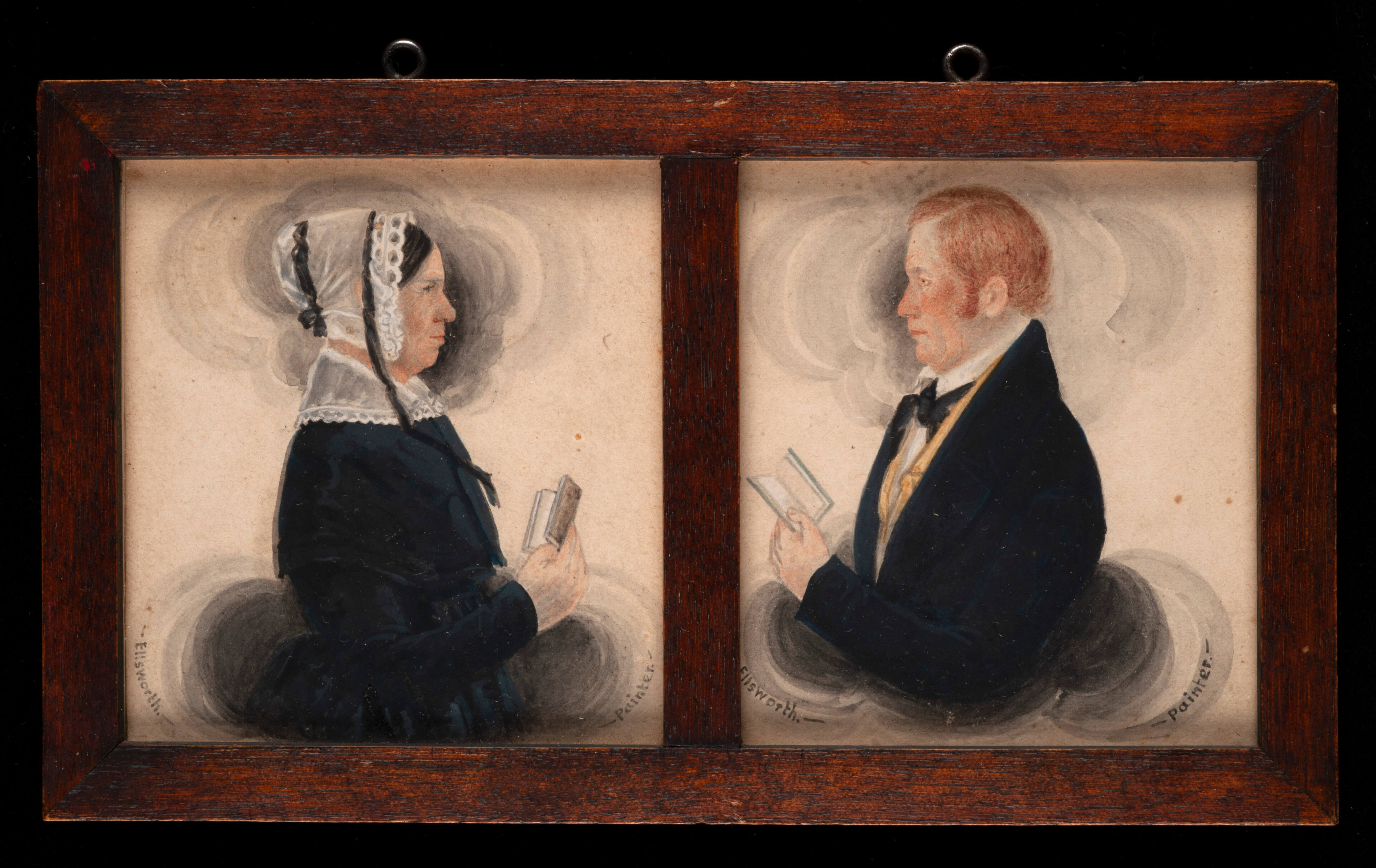 Label TextEllsworth's skill in drawing faces is illustrated in these portraits. Personality is suggested through delicate modeling and a sensitive use of color. Ellsworth probably spent most of his time and attention working on faces, as the bodies and hands of his subjects are less skillfully rendered and in a more stylized manner. Unusually large, glove-like hands often appear in his miniatures as he struggled to represent their correct proportion and form. Ellsworth tried to solve this problem by portraying his subjects holding books, flowers and occasionally fans, and by including only one of the sitter's hands.In many of his portraits in watercolor, Ellsworth included imaginative, aureole clouds at the base of the figures. He also included similar stylized, cloud-like formations around the heads and shoulders of the subjects, thus providing an effective contrast between the figures and the light background.