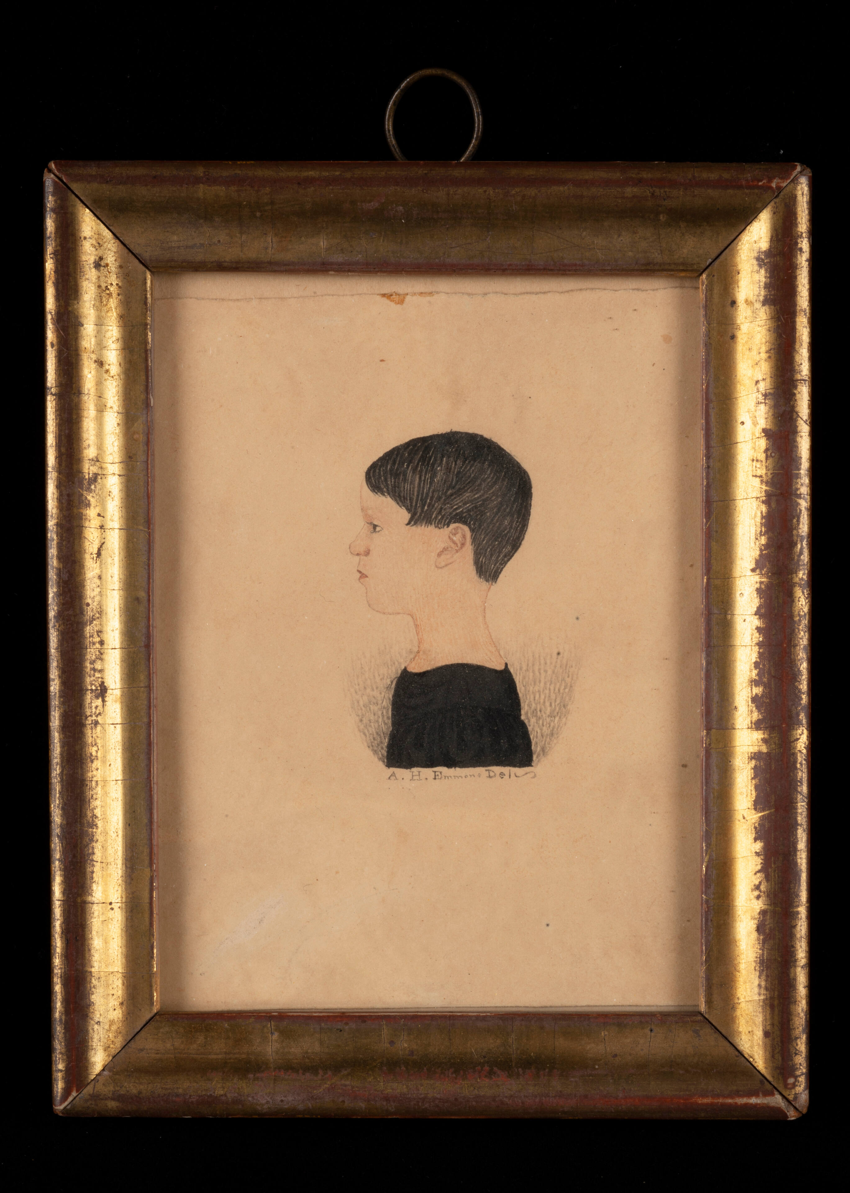 Label TextAlexander Hamilton Emmons was born on December 12, 1816 to Noadiah and Elizabeth Emmons of East Haddam, Connecticut. A house painter by trade, Emmons's interest in portraiture emerged when he made a sketch of a fellow worker which bore a close resemblance to the subject. Encouraged by his success at achieving this likeness, he began drawing portrait miniatures in watercolor on bristol board. To date, only a small number of Emmons's miniatures have been recorded to document his early, unschooled work. The two modestly rendered profile portraits depicting a boy and girl (N0070.61(2)) of the Reed Family demonstrate the artist's sensitive appreciation of his subjects' appearance. Emmons meticulously recorded their facial features with delicate lines and employed stippled brush strokes of color to add contour and form to their portraits. By outlining faces in dark tones of red or black and flanking shoulders in stippled surrounds, Emmons offsets these profiles against their neutral ground.At age eighteen, Emmons married his first wife, Mary A. Wilson of Norwich, Connecticut on October 8, 1835. For a short time, he resided in Norwich where he began painting half-length portraits of local citizens in oil on canvas. By 1841, he was advertising his services for "Portrait and Miniature Painting" in the "Norwich Courier" stating that "having recently had the benefit of instruction from many of the first artists of our county, he would invite the public to call and judge for themselves as to his abilities as an artist." By 1834, he had moved to Hartford, Connecticut where he opened his first studio and commenced business as a landscape and portrait painter, as well as an instructor of pupils in art.
