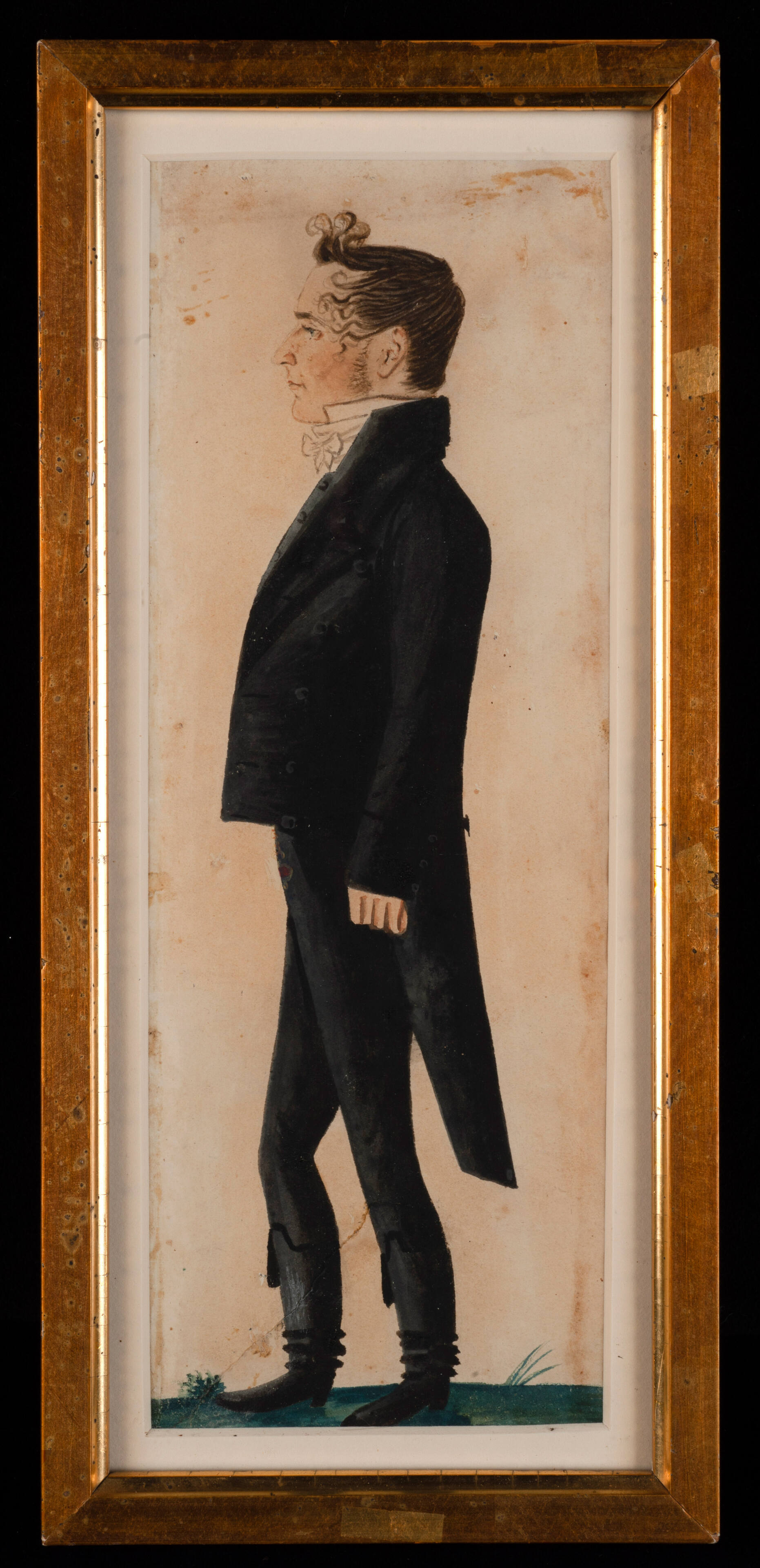 Label TextRendered in full-length profile, these two likenesses are typical of Maentel's early Pennsylvania portrait style. Women wear Empire-cut gowns, have tiny feet, and often hold a flower or purse in their hand (N0081.1961(02)). Men wear dark suits with tails, stand rigidly with their legs slightly bent at the knees, and sometimes hold a top hat in their hand. Likewise, the artist carefully delineated subjects' facial features with heavy eyebrows over thickly fringed eyelashes, darkened lower eyelids, emphasized nostrils and pronounced chin lines.ProvenanceMr. and Mrs. Howard Lipman, Wilton, Connecticut; Mr. Stephen C. Clark, Sr., Cooperstown, New York