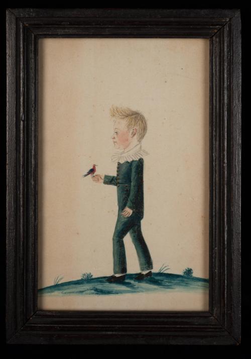 Label TextRendered in full-length profile, these two likenesses are typical of Maentel's early Pennsylvania portrait style. Women wear Empire-cut gowns, have tiny feet, and often hold a flower or purse in their hand. Men wear dark suits with tails, stand rigidly with their legs slightly bent at the knees, and sometimes hold a top hat in their hand (see N0081.1961(01)). Likewise, the artist carefully delineated subjects' facial features with heavy eyebrows over thickly fringed eyelashes, darkened lower eyelids, emphasized nostrils and pronounced chin lines.