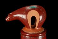 The piece itself would be called “Storage Jar.” That’s what it would have been used for in the old days. I started from the checkerboard design which means the connection from our Earth to the Spirit world up above. Then you put in the little dots (turquoise) which represent corn and that brings out the meaning of the storage jar. There are over 900 pieces of turquoise inlaid on the jar. The bear is the protector of the people. He’s sitting on top in his big pose, looking down over the pot and the people because that is what will sustain them. It may be a contemporary piece, but everything is based on traditional ideas and beliefs. —Russell Sanchez