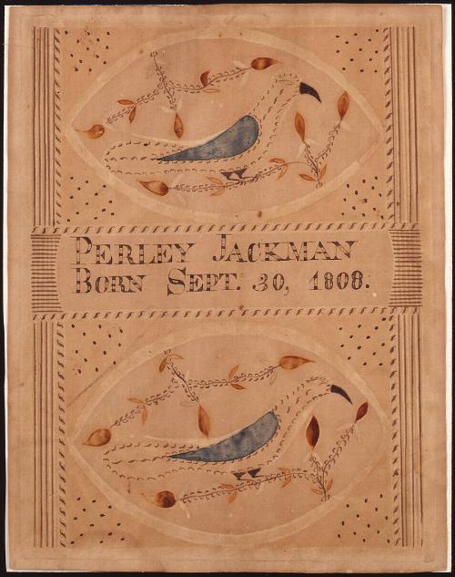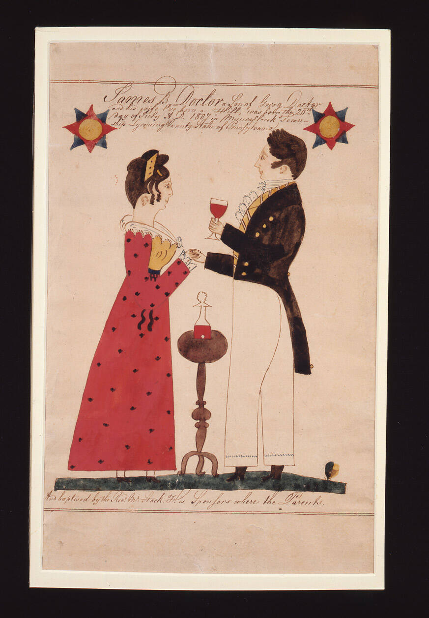 Label TextDecorated family records, commonly called frakturs, served as official documentation and were required by law in Europe and later by Germans who settled in Pennsylvania. Typical motifs that reflect religious and cultural heritage include hearts, vines, flowers, and human figures. Henry Young, an immigrant from Saxony, rendered at least 13 frakturs while working as a teacher in Mifflinburg, Pennsylvania from 1817 to 1861. This birth and baptismal certificate commemorates the 1807 birth of James B. Doctor to George and Eva Doctor of Muncycreek Township, Pennsylvania. Its completion 23 years after James' birth may indicate it was made for his betrothal or wedding.BibliographyShelley, Donald A. "The Fraktur-Writings of Illuminated Manuscripts of the Pennsylvania Germans." (Allentown, PA: PA German Folklore Society, 1961, pp. 133-135, plate 224-227.