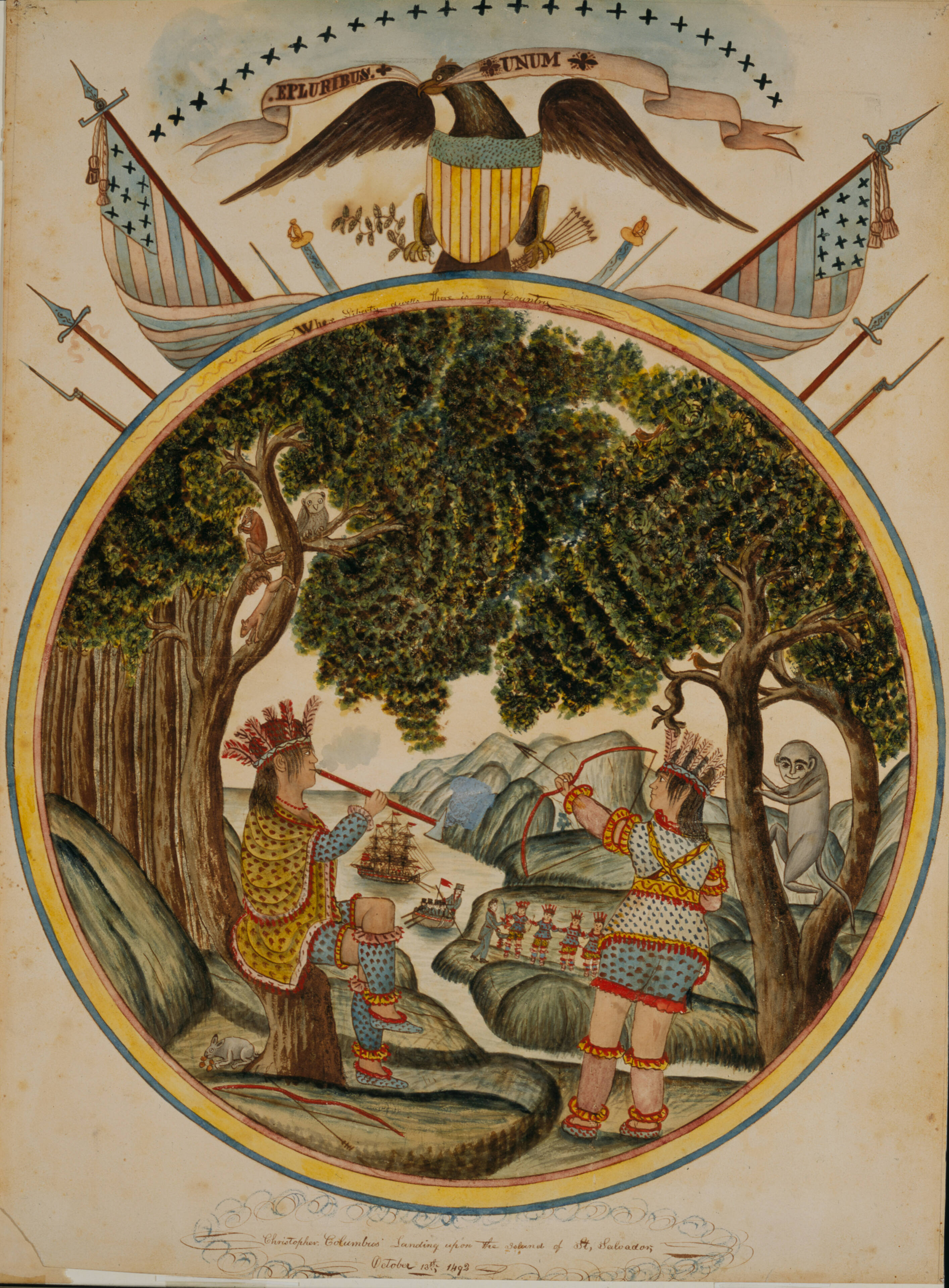 Label TextThis decorative and imaginative picture combines Christopher Columbus' landing (possibly based on a print) with other patriotic symbols such as the eagle from the Great Seal of the United States, flags and military accoutrements, and the slogans "E Pluribus Unum" and "Where Liberty dwells there is my country." For generations of European Americans, Columbus' discovery of the New World was celebrated for providing a land of opportunity, prosperity, and freedom from economic and political oppression in Europe.Exhibition History“Art of the Everyman: American Folk Art from the Fenimore Art Museum,” Florence Griswold Museum, Old Lyme, CT, May 28, 2014 – September 29, 2014.