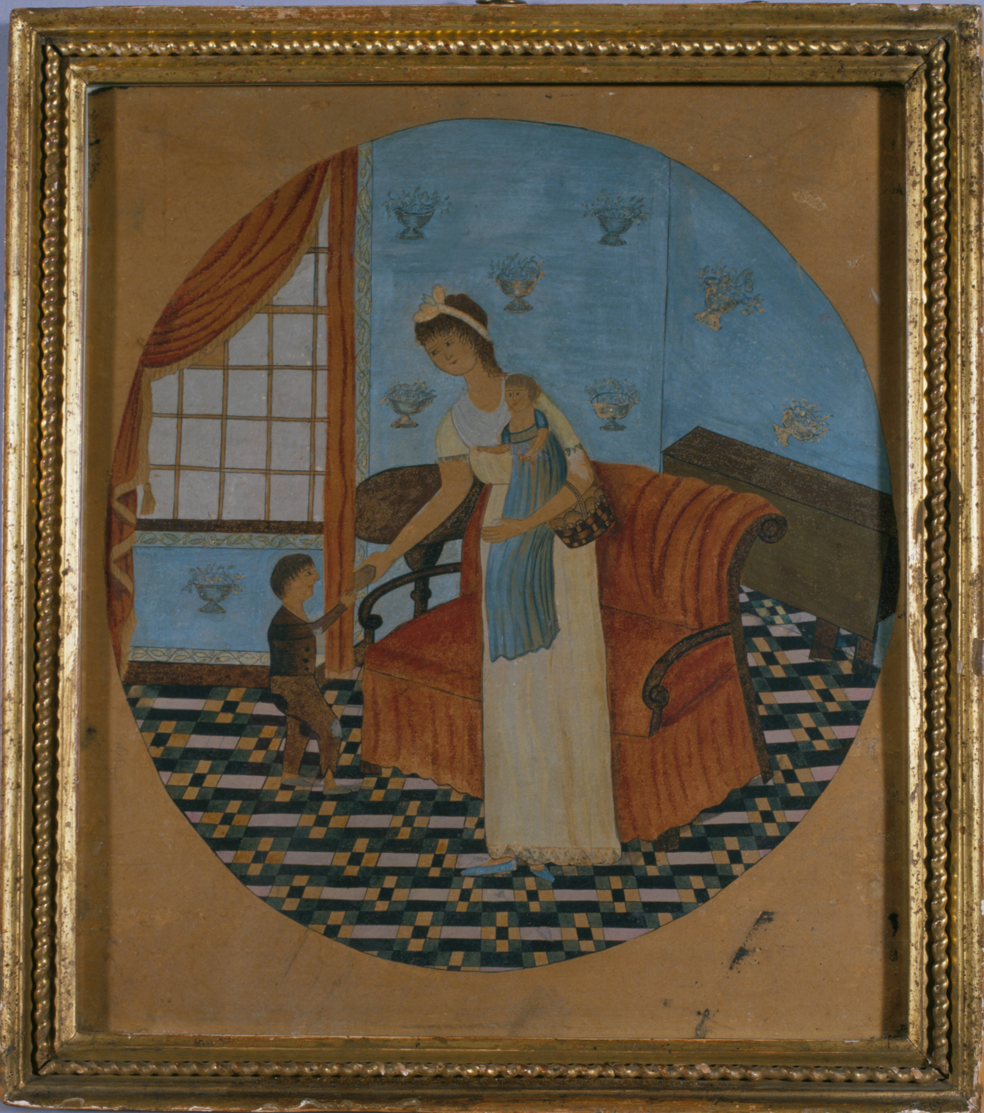 Label TextAmerican schoolgirl artists often depicted the theme of Charity offering a bun to a beggar child, an image which was derived from an English print. This unknown artist placed the subject in an interior which includes a painted floor or floorcloth, decorative wallpaper and draperies, and classically inspired furniture.On View