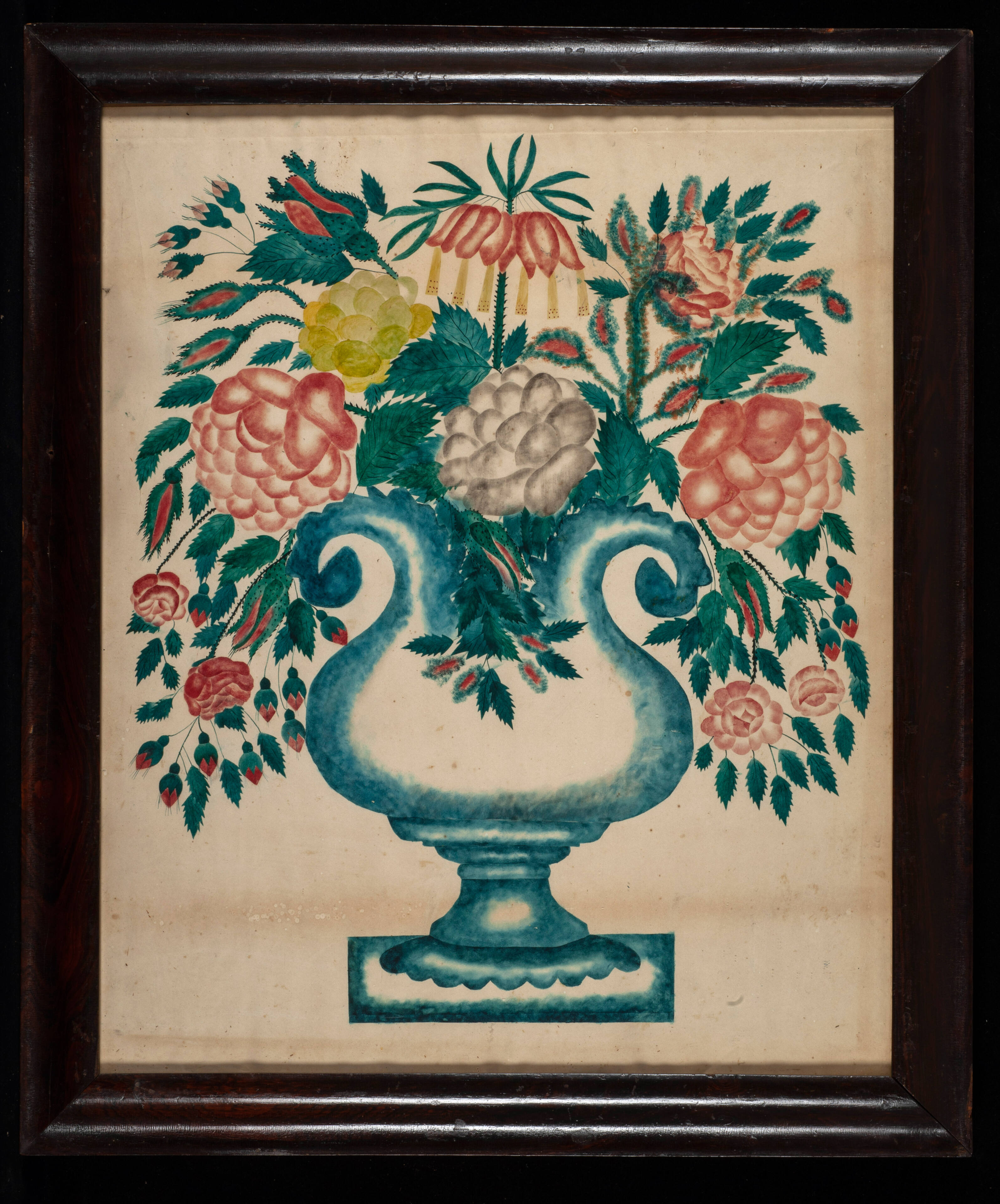 Label TextTheorem paintings are watercolors or oils on velvet or paper. Whether painted freehand or more characteristically by using stencils, this type of painting was constructed in parts, according to a kind of formulas. It consisted of tracing a design on transparent paper, cutting out the pattern and using the resulting stencil. Despite the use of stencils, it required considerable deftness and imagination to combine shapes and shaded colors into pleasing designs. The still life composition was a popular motif, often depicting fruit or flower baskets, or birds.On View