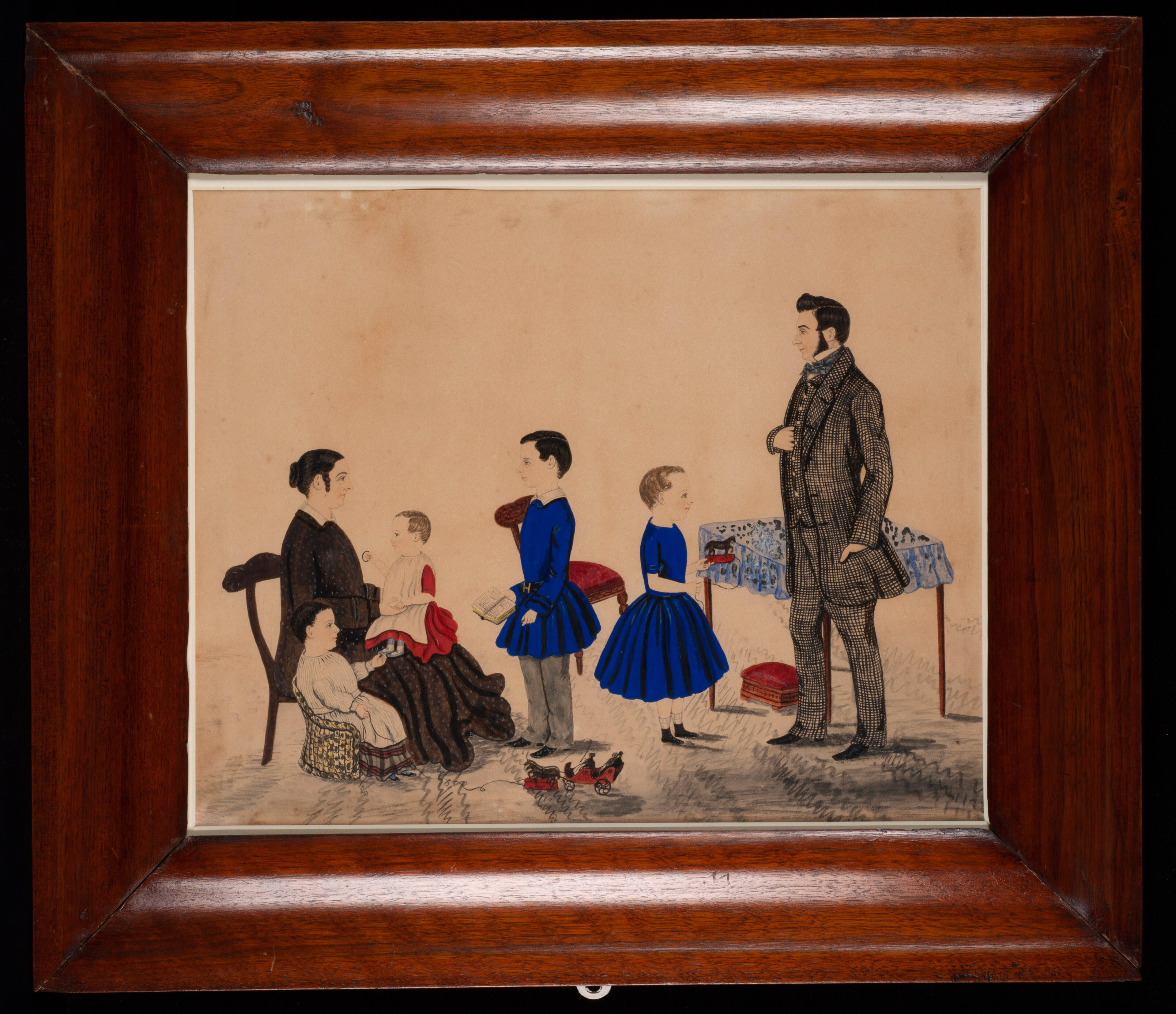 The individual personalities of the sitters, difficult to convey in profile portraiture, are somewhat evident here. The parents flank their four children and give an emotional as well as compositional unity to the scene. This sense of communication is also apparent in the attention bestowed on the baby by both the mother and the child at her side. With an eye toward accuracy, the artist carefully included details such as the cast-iron wheels on the pull toy at the bottom center of the picture, the well-outlined drawings in the geography book held by the oldest boy and the meticulously-rendered pieces of furniture. The brilliant blue costumes of the two children standing in the center of the scene are complemented by the red color of the baby's dress, pull toys and upholstery of the unoccupied chair and footstool.