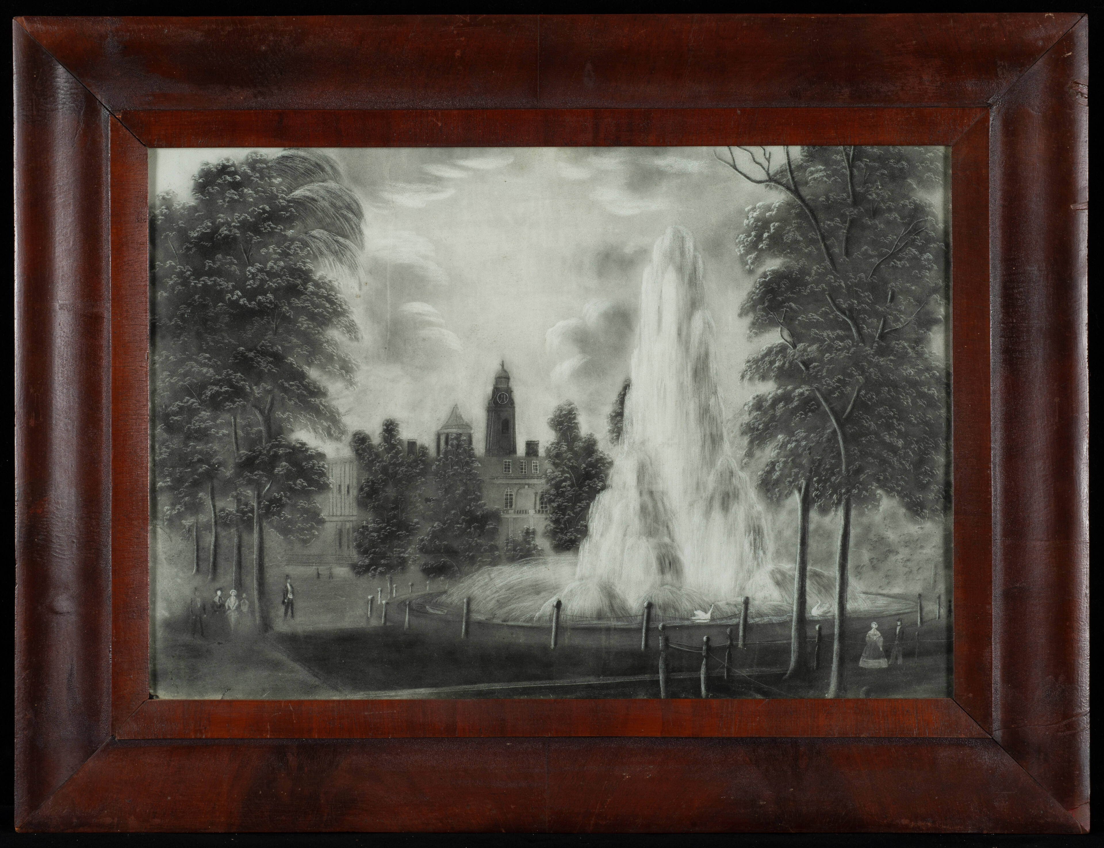 Label TextThe fountain at the southern tip of City Hall Park in New York City was the subject of numerous views in published engravings and lithographs. This picture was undoubtedly based on one such print, and was probably executed in New England, as the paper bears a Boston manufactory’s stamp on the reverse.On View
