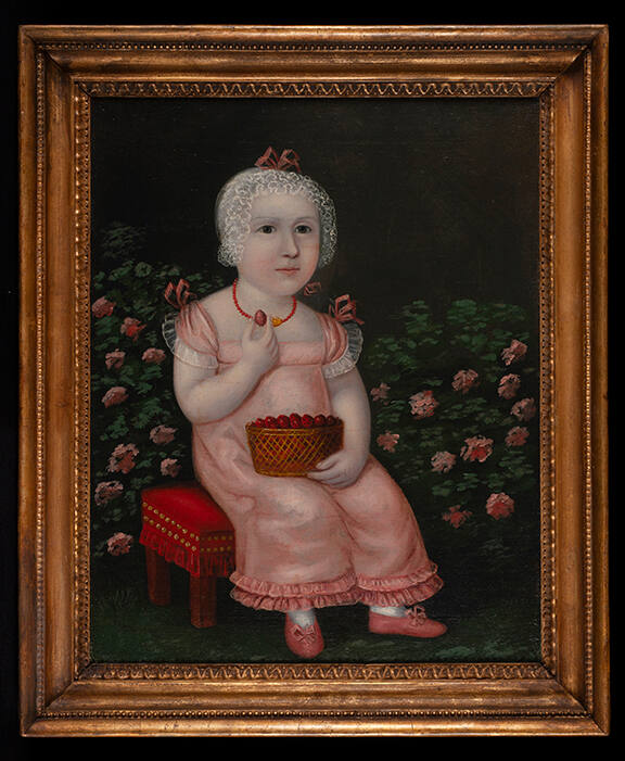 Label TextJoshua Johnson is considered America’s first professional African American portrait painter. He was first identified by name in 1939 by the scholar J. Hall Pleasants, yet he remains an enigmatic figure. Family histories and a listing as a “free coloured person” in the 1816-1817 Baltimore City Directory indicated that he was African American, but his background was unknown until the 1990s when newly discovered court records revealed his mixed-race heritage. In 1782, he was apprenticed to a blacksmith, but little is known of his life until 1796, when he is listed as a portrait painter in the Baltimore City Directory. Two years later, he placed his first advertisement, in which he noted that he was a “self-taught genius.” Seated Girl with Strawberries ranks among his very best likenesses of a child, notable for the inherent beauty of the sitter, her distinctively pleasant expression, the vibrancy of the pink color of her dress and red shoes. The seated figure is unique for Johnson as he usually depicted a standing child in his signature flowering garden. Here, the girl holds a strawberry in a half-raised right arm, a pose Johnson used in several other portraits done in the same period.