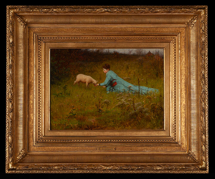 The decorative female figure became a popular theme linked to romance through such devices as reverie, letter reading, or expectant attitudes. Despite renewed feminist activism and attempts at reform during the years following the Civil War, the notion that women were born to be wives and mothers was still a predominant train of thought during the 1870s. In Johnson’s rendition, the woman seems to be engulfed by the pasture, the faintest hint of the horizon with a roofline visible in the upper register of the panel. Johnson’s composition emphasizes the vastness of the field and creates a heightened feeling of isolation of the woman and her lamb alone in nature. Perhaps Johnson is drawing a parallel between the compliant nature of the pet lamb and the type of behavior expected from women in 19th century American genteel society.