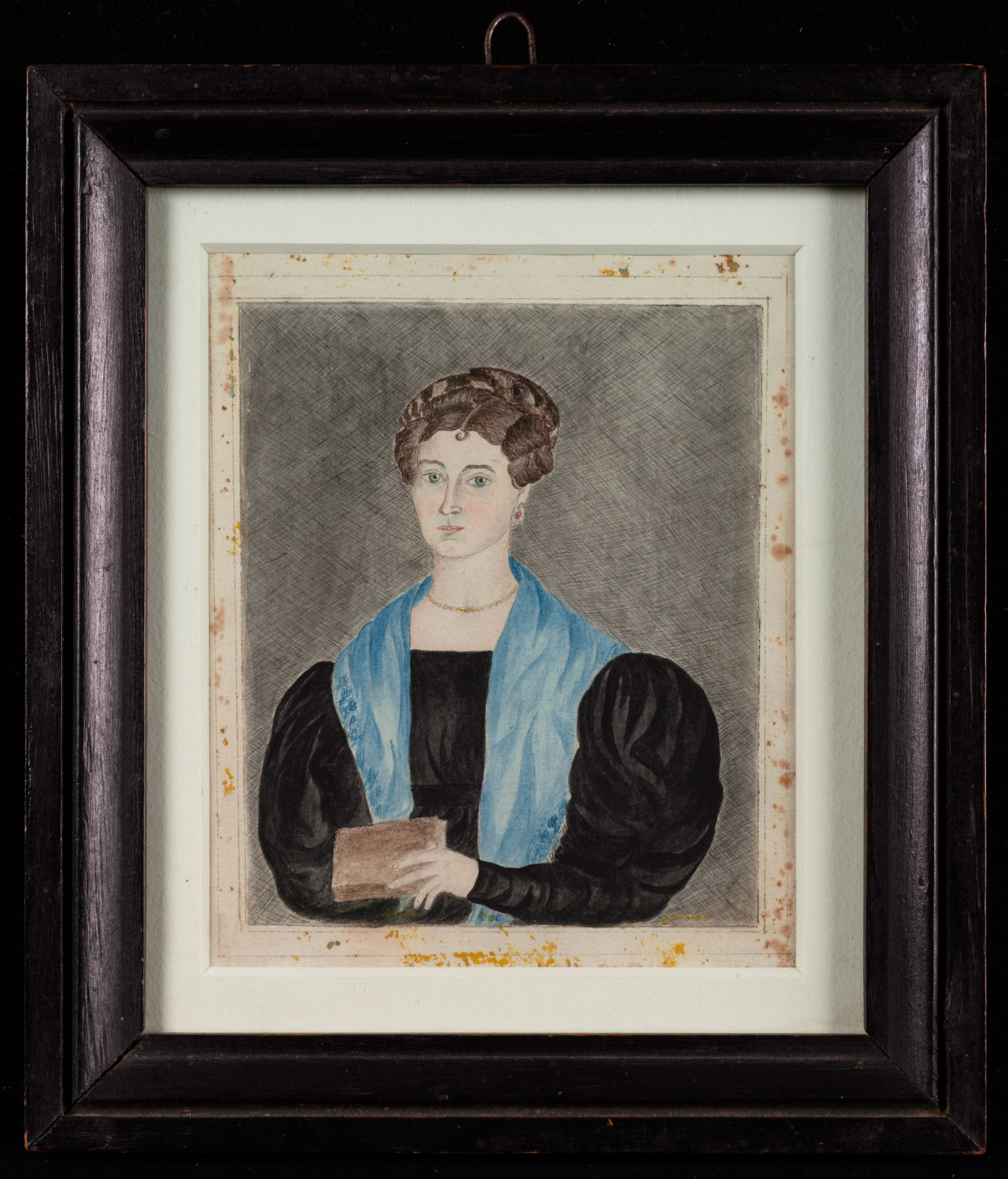 Label TextDeborah Goldsmith, born in Madison County, New York, had a brief but successful career as an itinerant portrait painter. She traveled to neighboring counties executing likenesses for friends and acquaintances. It is not known if she had any professional training, but her sketch books point to her familiarity with the decorative idioms and pictorial clichés popular among schoolgirls and other amateur artists of the period. Goldsmith died at age 27, and her family preserved her friendship albums, paintings, worktable, and supplies.