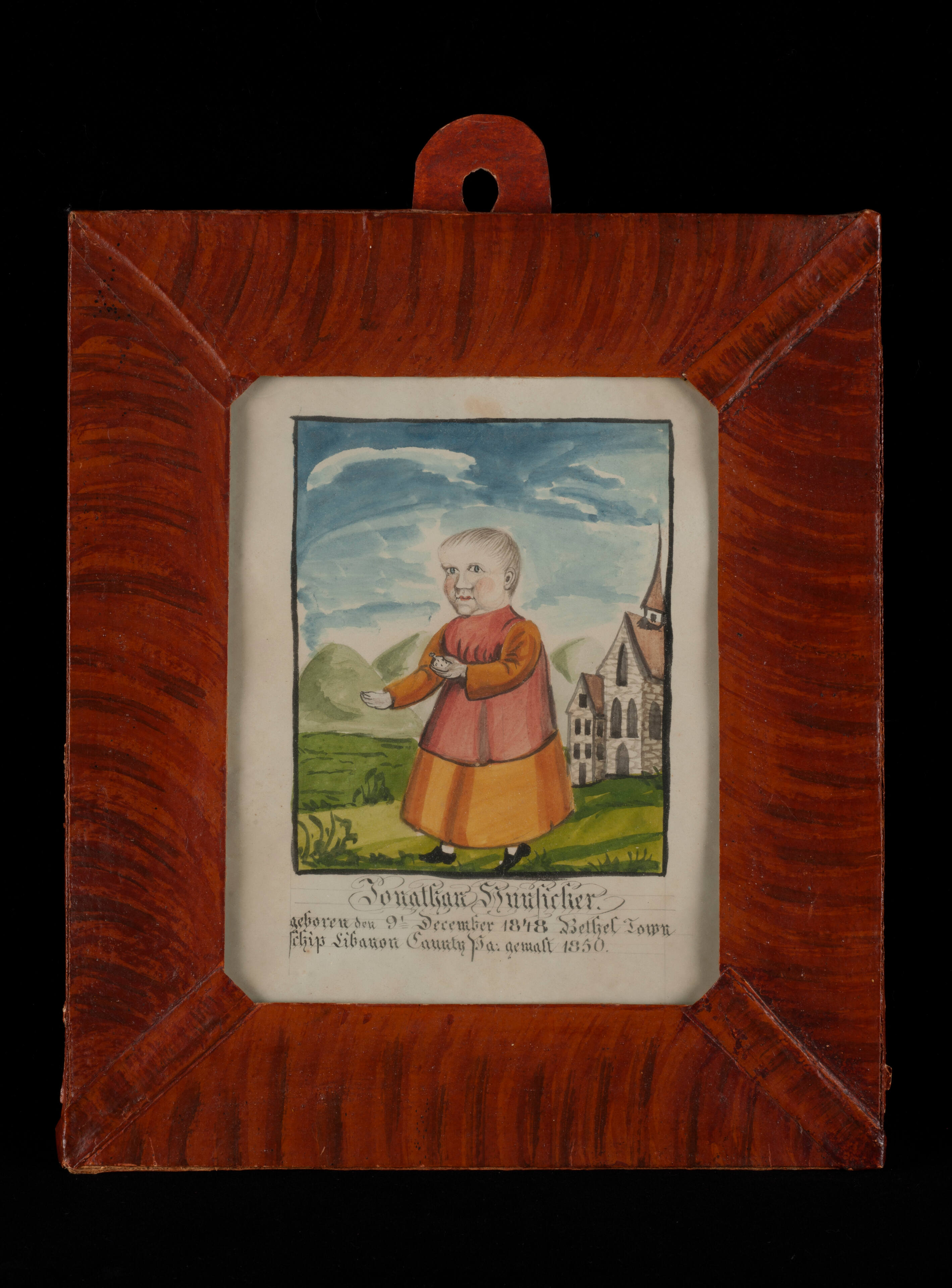 Label TextThese portraits (see N0104.61, N0105.61, N0107.61) belong to a group of over twenty-five stylistically related watercolors executed between 1835 and 1850 in Berks, Lebanon and Lancaster counties, Pennsylvania, by an unidentified portraitist referred to in recent years as "The Reading Artist." The sitters in this group were probably all of Germanic extraction and are usually depicted in one of two loose variations on this artist's basic formula: standing or seated outdoors next to a stone building or picket fence or seated in an interior setting next to a window and surrounded by patterned walls and floors. The works are stylistically marked by a robust and intense treatment of facial features, stiff, upright postures and quickly but effectively painted backgrounds. Many of these portraits are accompanied by cardboard frames grain-painted to simulate wood.ProvenanceTitus Geesey, Wilmington, Delaware; Mr. and Mrs. Howard Lipman, Wilton, Connecticut; Mr. Stephen C. Clark, Sr., Cooperstown, New York