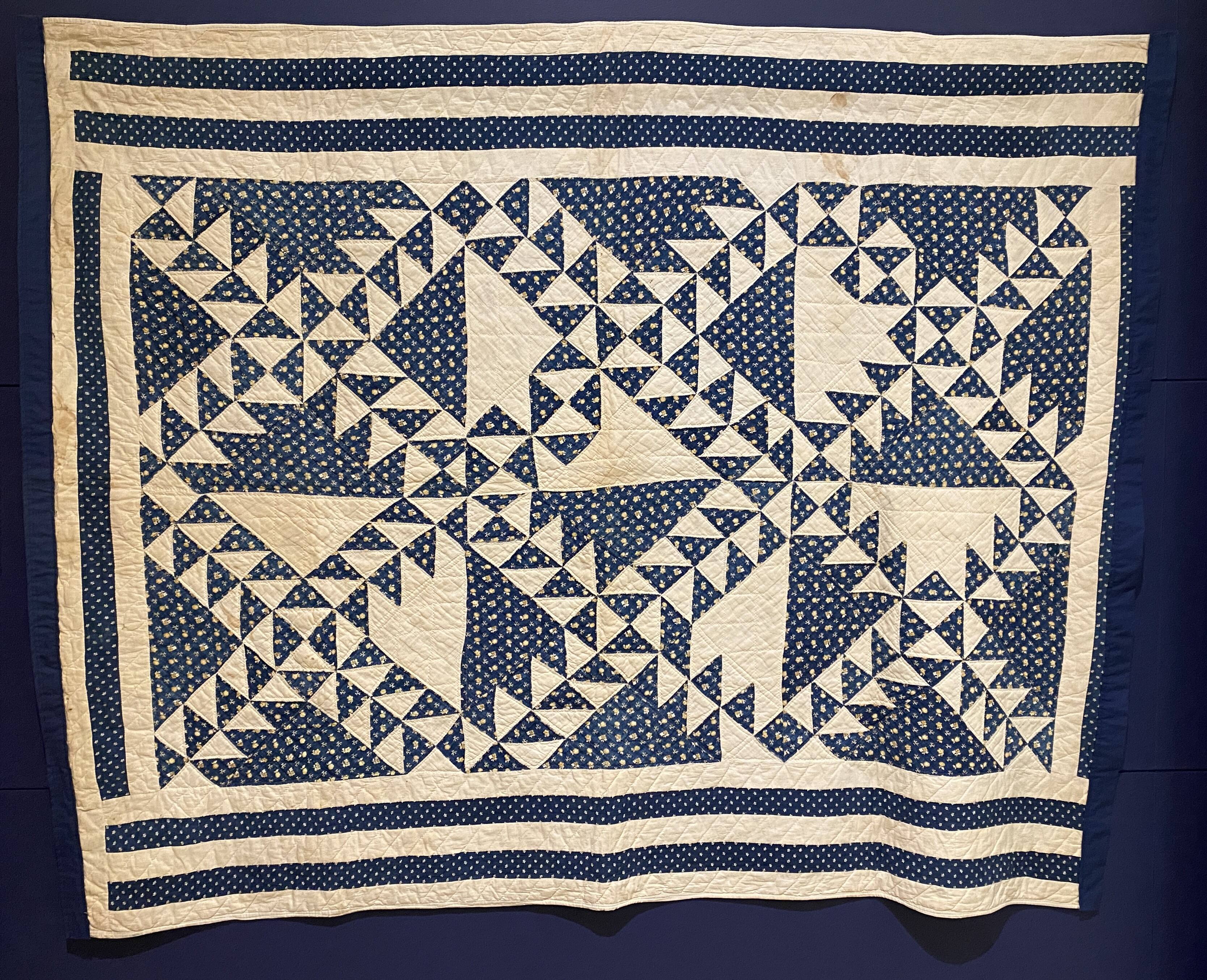 Label TextThe increasing availability of colorful printed cottons in the early nineteenth century makes it unsurprising that quilting soon became nearly synonymous with patchwork designs in which piecing different fabrics together was the main aesthetic focus. Quilting was still important to hold the layers of the coverlet together, but the stitching often followed the lines of the piecing and took on simpler geometric shapes in open areas.Pineapples appear in a number of different quilt patterns, sometimes pieced and sometimes appliqued. The Pennsylvania Pineapple specifically refers to the combination of the Flock of Birds diagonal rows of paired triangles with central squares also made up of paired triangles, which come together to give the impression of sawtoothed forms.