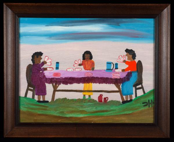 Label TextClementine Hunter is one of the best known 20th-century folk artists. A descendant of slaves, Hunter spent the majority of her life on Melrose Plantation in Louisiana. Hunter's art was inspired by her plantation life. She depicted plantation hands at work, at church, and at play, as well as floral still lifes, and portraiture. Hunter's early works were brought to the attention of François Mignon, a writer, and James Register, a professor at the University of Oklahoma. From the beginning, both men encouraged her work, and they arranged for her first public show in 1946. From then on, Hunter became increasingly well known.On View
