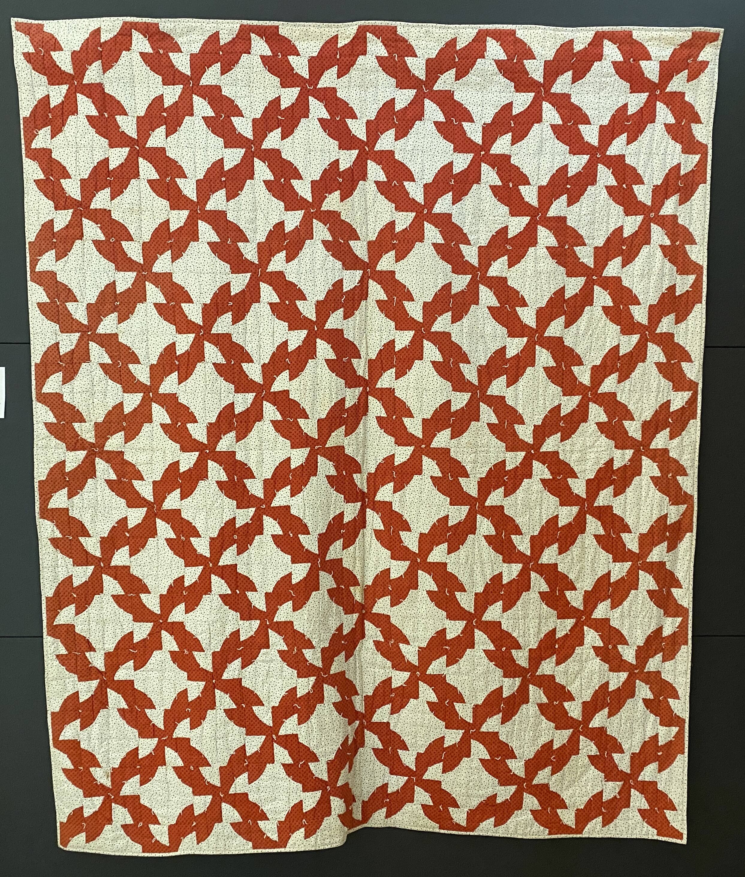 Label TextThe basic block of Drunkard’s Path is simply a square with a curve cut out and swapped with a curved piece cut from a contrasting square. These blocks are then paired with each other in such a way as to create a twisting or pinwheeling shape. This particular iteration has a number of evocative names that reflect the winding of the pattern and the way that the individual pieces fit together, including but hardly limited to: Wanderer’s Path, Robbing Peter to Pay Paul, Old Maid’s Puzzle, and Pumpkin Vine.On View