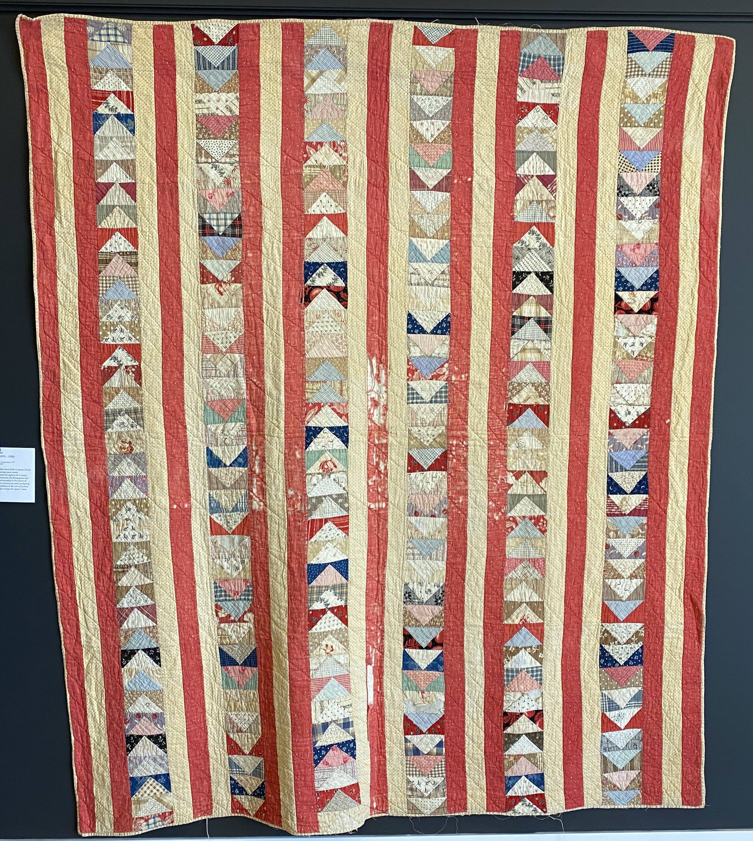 Label TextStrip quilts were less common than quilts built on square blocks, and not generally represented among more artistic quilt styles, though they were made throughout the century. Accordingly, the triangles that represent the flying geese and their backgrounds here show little intentionality in the choice of fabric and color: a great variety of prints are used, producing no clear pattern. However, the addition of the red and yellow stripes in alternating groups helps to keep the “geese” more regimented and less chaotic.On View