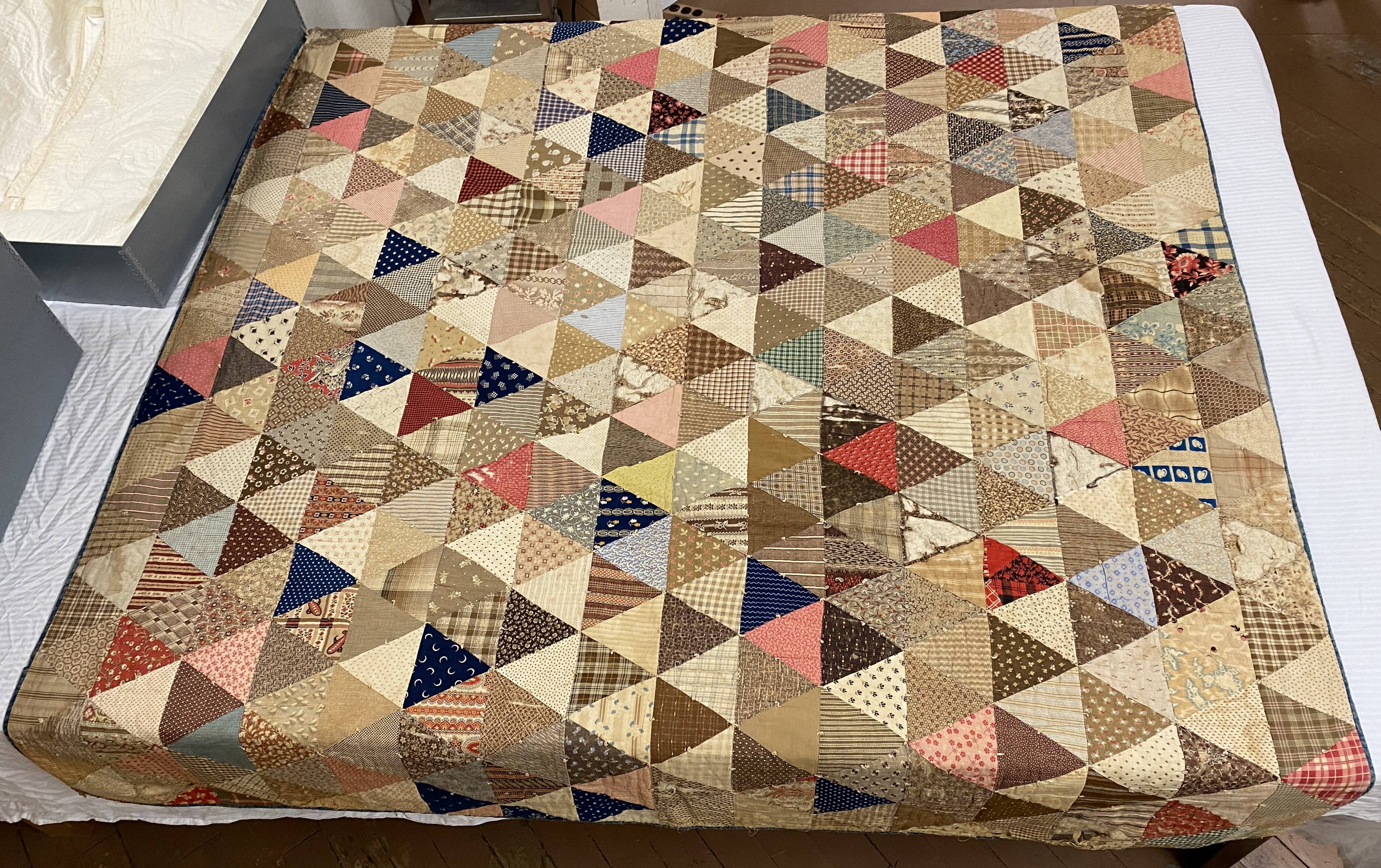 Label TextQuilts made with a single shape of patch repeated across the entire top are called “charm quilts,” and frequently reflected a desire to use a different fabric for every piece. The maker of this quilt appears to have achieved this goal. While there appears to be little patterning as to color, in general she placed darker triangles pointing in one direction and lighter triangles in the other. She also chose not to quilt the piece, but instead to tie it: making a single stitch, knotting the thread around it, and cutting it so that it stands alone. This is a quicker but significantly less skillful or attractive means of finishing a quilt.On View