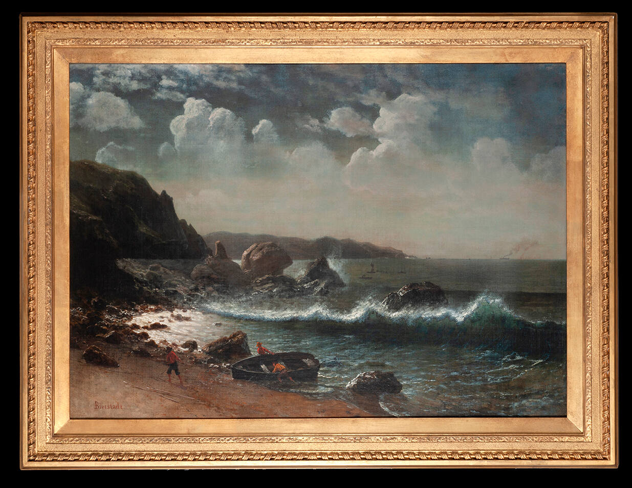 Label TextBierstadt resided in California between 1871 and 1873, where he used San Francisco as his base. The Pacific Ocean held great appeal to the artist, and he took this opportunity to create dozens of oil sketches and paintings of the coast. In this scene, Bierstadt sketched the rocky cove under the dramatically perched original Cliff House. Constructed in 1863, the Cliff House provided stunning views of the ocean and the Marin headlands. Though originally sketched during his time in San Francisco, this painting was created at his studio in Waterville, New York. Bierstadt’s return to New York was reported by the Bulletin of October 27, 1873, which noted that “the artist would work many of his Pacific Coast sketches into pictures.” The Golden Gate is a poignant reminder of Bierstadt’s unmatched ability, setting the tone for a picture that, here, represents the toils of man against august nature in the transient beauty of a moment.