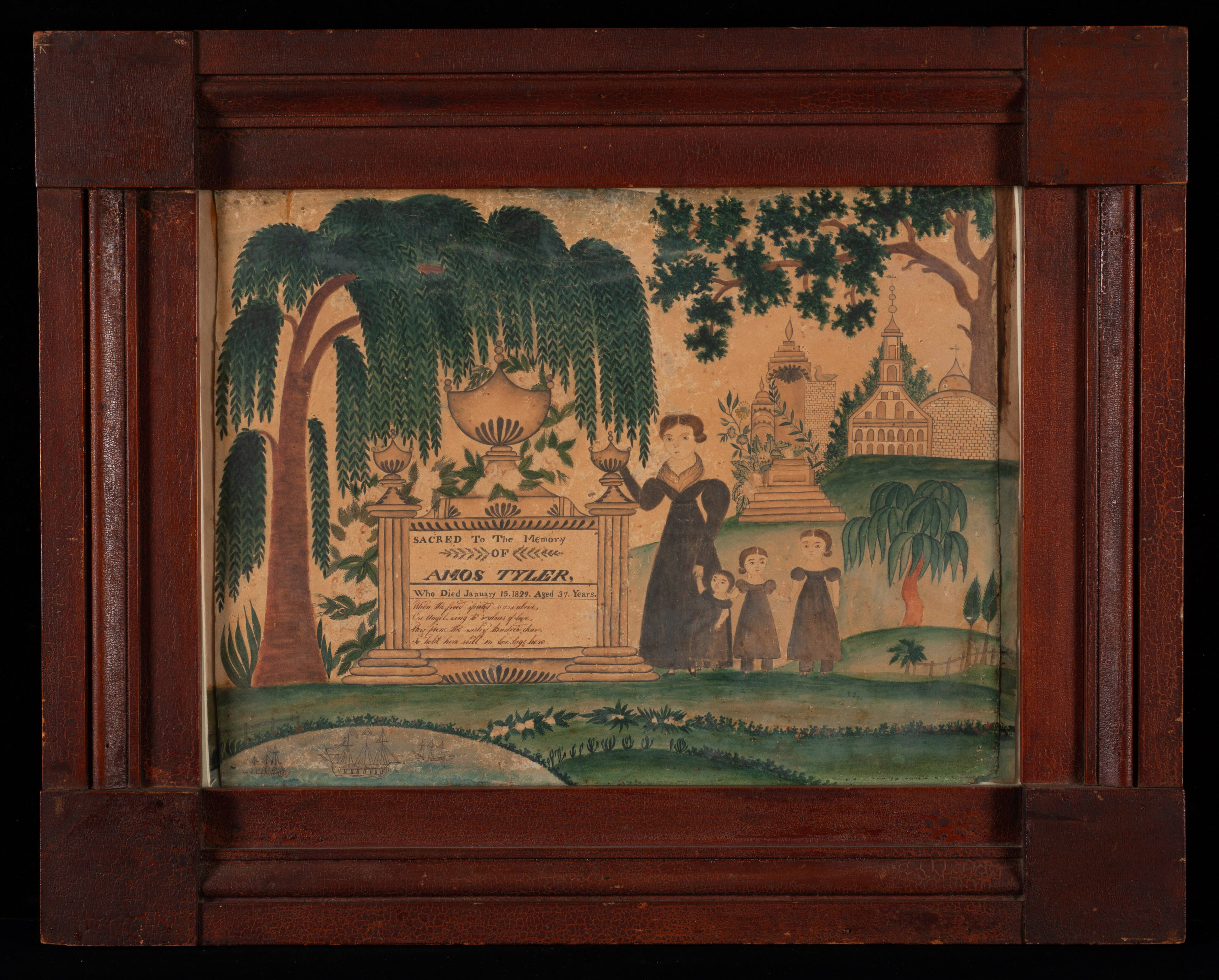 Label TextDuring the early 19th century, women painted and embroidered countless scenes honoring departed friends and relatives. They were an expression of the universality of death and a belief in eternal life with a promise of heavenly reunion. Frequently an important part of the curriculum in female seminaries, these mourning pictures derived from late 18th-century European and English design sources and typically included grieving figures, funeral urns, and weeping willows. This particular memorial remembers Amos Tyler, who died on January 15, 1829, at the age of 37. Four figures, presumably his wife and three children, stand by the gravesite. The watercolor is notable for its fanciful depiction of a church and several monuments at the upper right. The overall patterning of forms makes for a visually striking scene.BibliographyLipman, Lipman & Alice Winchester. "The Flowering of American Folk Art." NY: The Viking Press, 1974, pp. 77-78, 85-87.