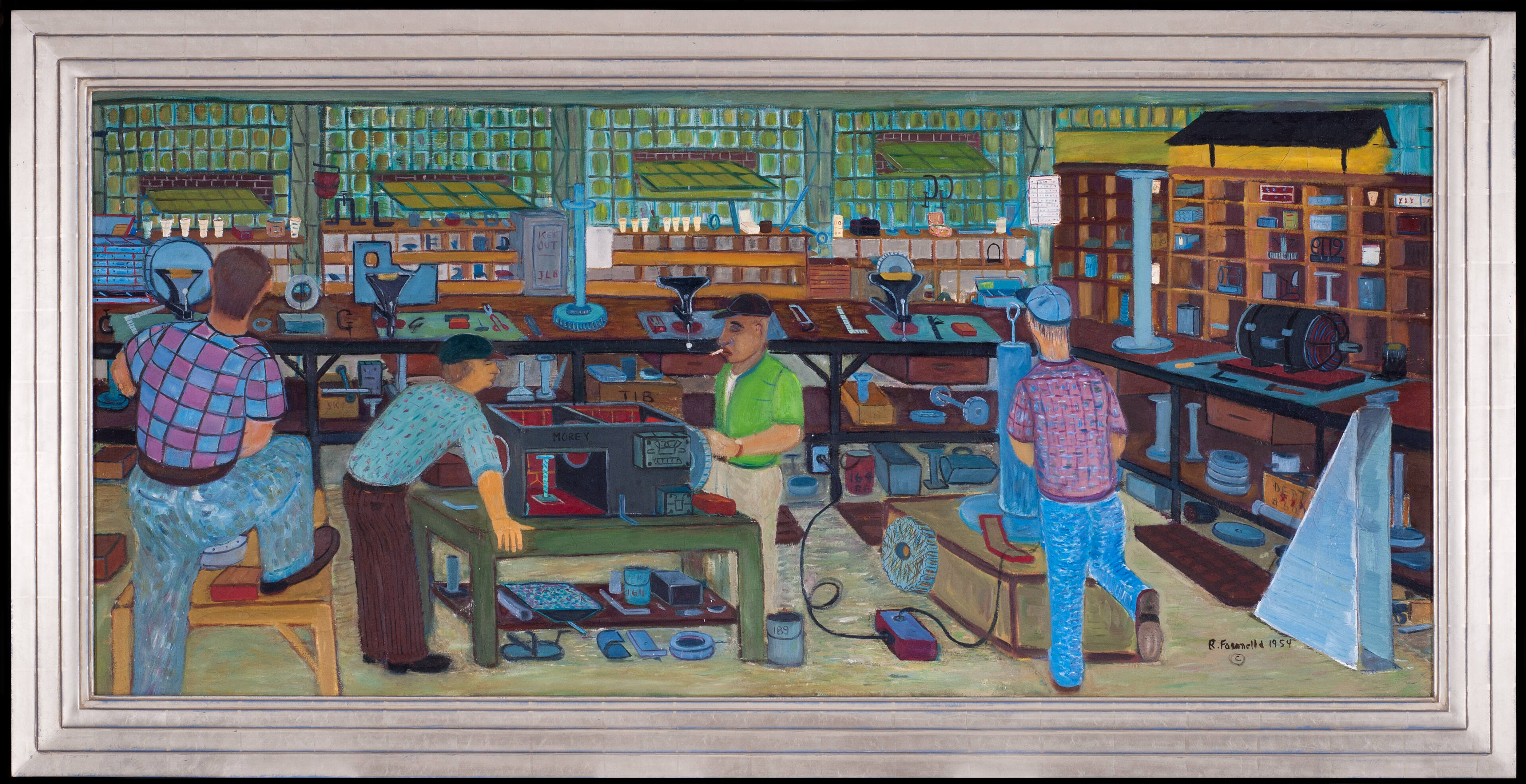 Label TextIn the early 1950s Fasanella found steady employment through the United Electrical, Radio, and Machine Workers of America at the Morey Machine Shop in Long Island City. The job provided a brief respite from the difficulties he encountered during the McCarthy era as a result of his radical affiliations. Fasanella painted the machine shop in at least two major works executed at the time. In Bench Workers, the artist provides a meticulous visual record of the shop down to the most minute details, and experiments with large-scale figures. He has depicted himself at the right, drilling holes into sheet metal.Exhibition History"Ralph Fasanella's America," Statue of Liberty National Monument/Ellis Island Immigration Museum, New York, NY, July 19, 2003 - September 26, 2003; The Mennello Museum of American Folk Art, Orlando, FL, August 15, 2002 - November 17, 2002.