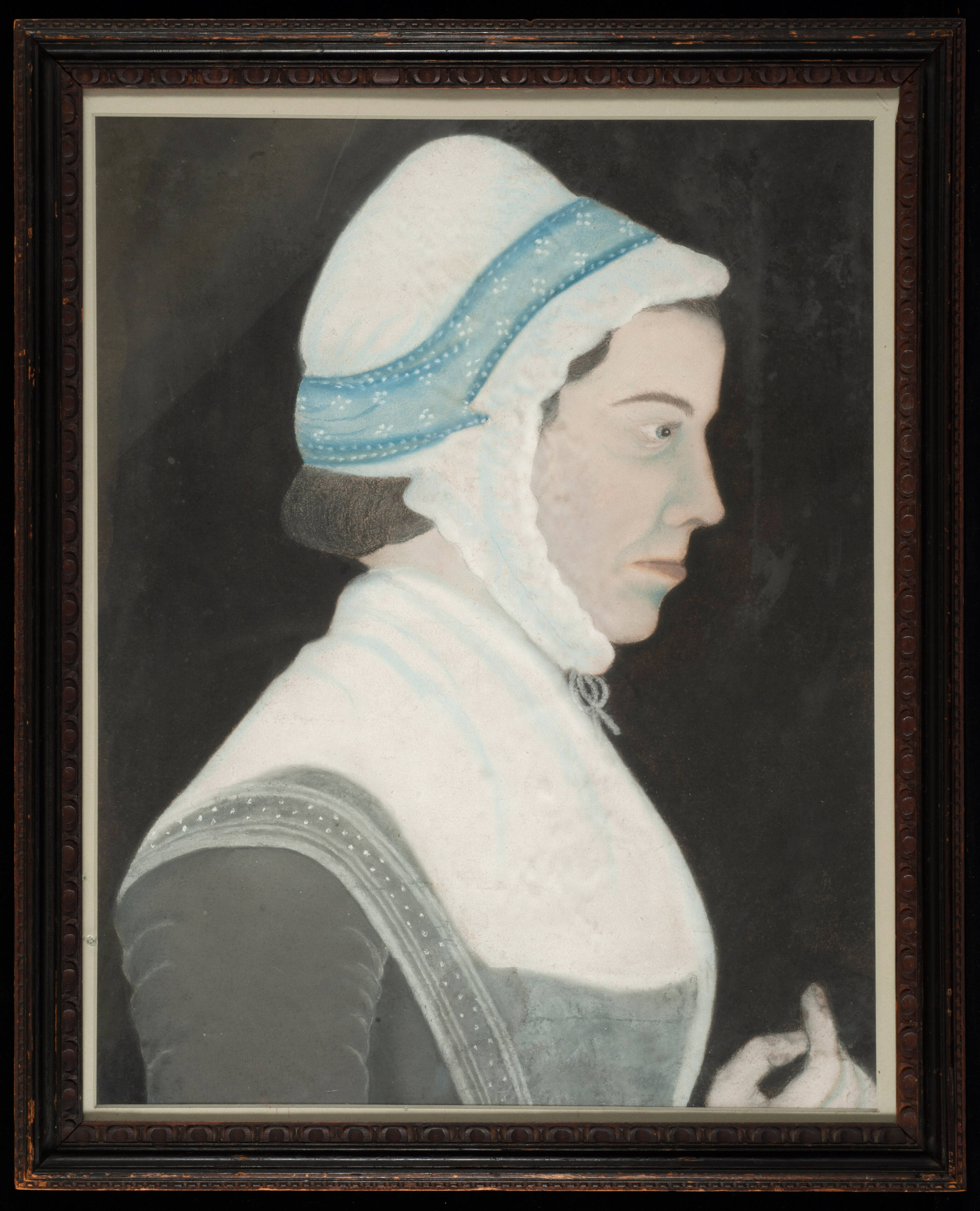 Label TextA strong sense of character is captured by the artist in the stern, tight-lipped expressions and penetrating gazes of these sitters (see N-111.61(1)). However, the difficulties encountered by the portraitist in the definition of anatomical features are evident in the man's undersized ear, his oddly hooked nose, and the woman's stubby hand. Teardrop-shaped eyes with dilated pupils and pale lines of color adding definition to costumes also seem to be distinctive stylistic traits of this unidentified hand. The man's long hair is given texture by the use of quickly drawn lines, while the woman's hair, tucked underneath her bonnet, is rendered in a tight, controlled manner.ProvenanceFound near Cambridge, Massachusetts; Mr. and Mrs. Howard Lipman, Wilton, Connecticut; Mr. Stephen C. Clark, Sr., Cooperstown, New York