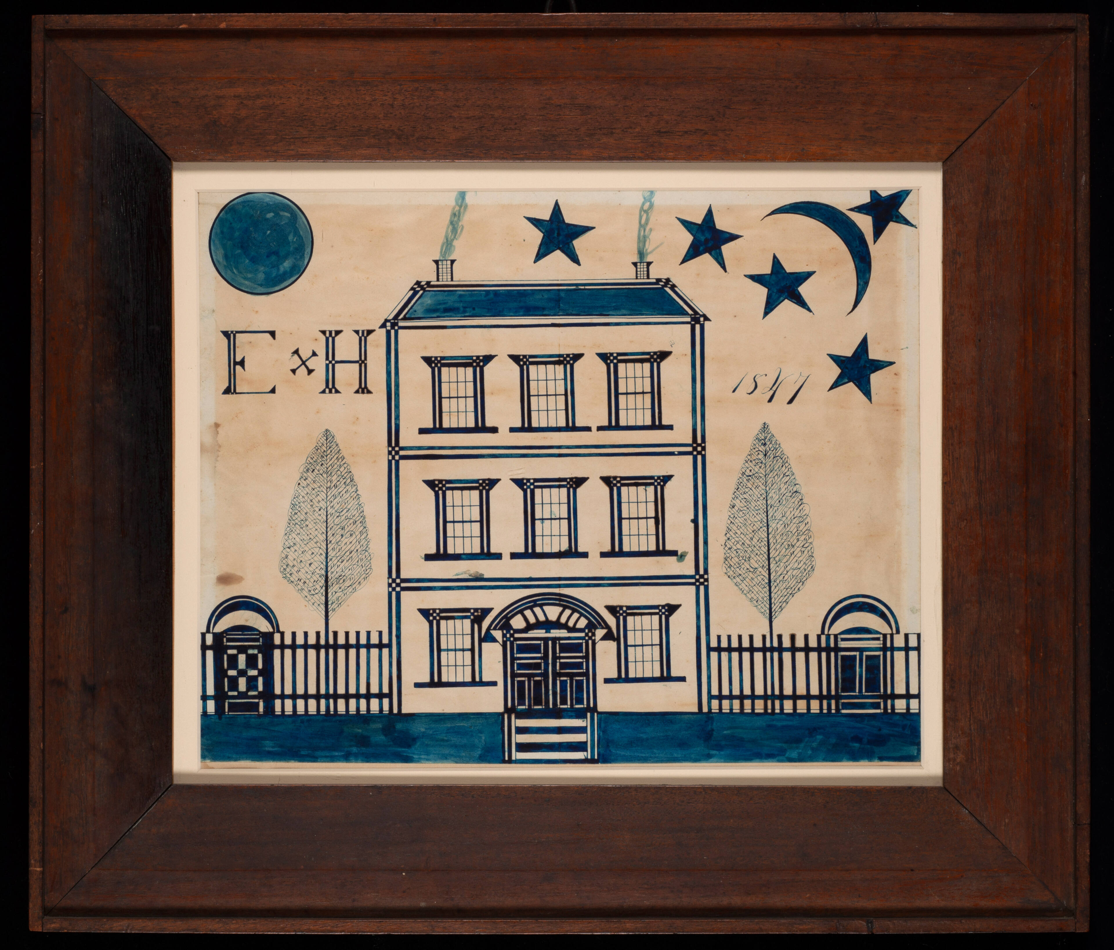 Label TextThis fanciful, decorative painting combines two valued 19th century skills--watercolor and calligraphy--into a bold abstraction of a house with moon, sun, and stars above. The house is painted in a rigid, angular style that resembles cross-stitching, and the tree branches are executed in calligraphic flourishes. It seems likely that this work was done in a female seminary, where such skills were taught.Exhibition History“The Flowering of American Folk Art,” M.H. de Young Memorial Museum, San Francisco, CA, June 24, 1974 – September 15, 1974; Virginia Museum of Fine Arts, Richmond, VA, April 22, 1974 – June 2, 1974; The Whitney Museum of Art, New York, NY, February 1, 1974 – March 24, 1974.
