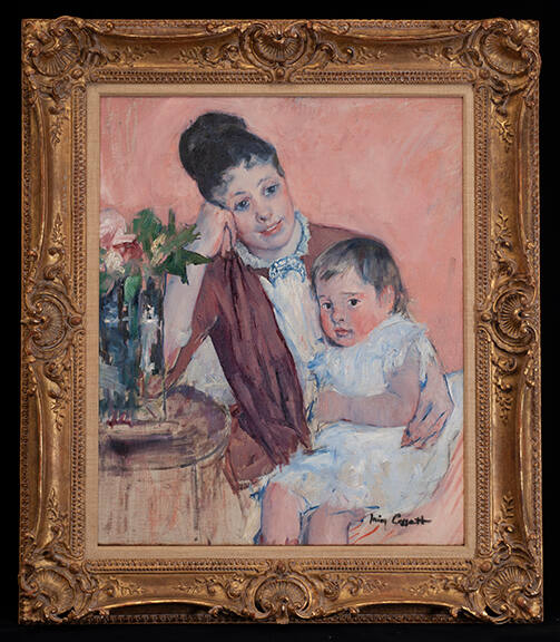 Label TextMadame de Fleury and Her Child exemplifies a remarkably contemporary re-imagining of the timeless subject of mother and child. This composition was executed in the early 1890s, a period frequently regarded as the peak of Mary Cassatt's artistic career. As one of few women to exhibit with the otherwise male-dominated Impressionists, Cassatt broke new ground with her focus on sensitive and highly modern depictions of motherhood, intimate family scenes and the lives of women, capturing the complexities of women's roles in contemporary French society. The present work is a rarity within Cassatt’s oeuvre, as the artist often preferred to use models rather than real mothers and their children in her maternal scenes. Here, she paints a friend in her artistic circle, Marie de Fleury who sits with her young child. The sitter was the sister-in-law of sculptor Paul-Albert Bartholomé and shared a close friendship with both Cassatt and Edgar Degas. The specificity of the portraiture and natural positioning of the subjects in this painting set it apart from her otherwise more idealized depictions of motherhood. As if captured in an off-hand moment, Madame de Fleury and Her Child distinctly underscores its modernity in this snapshot of contemporary life.