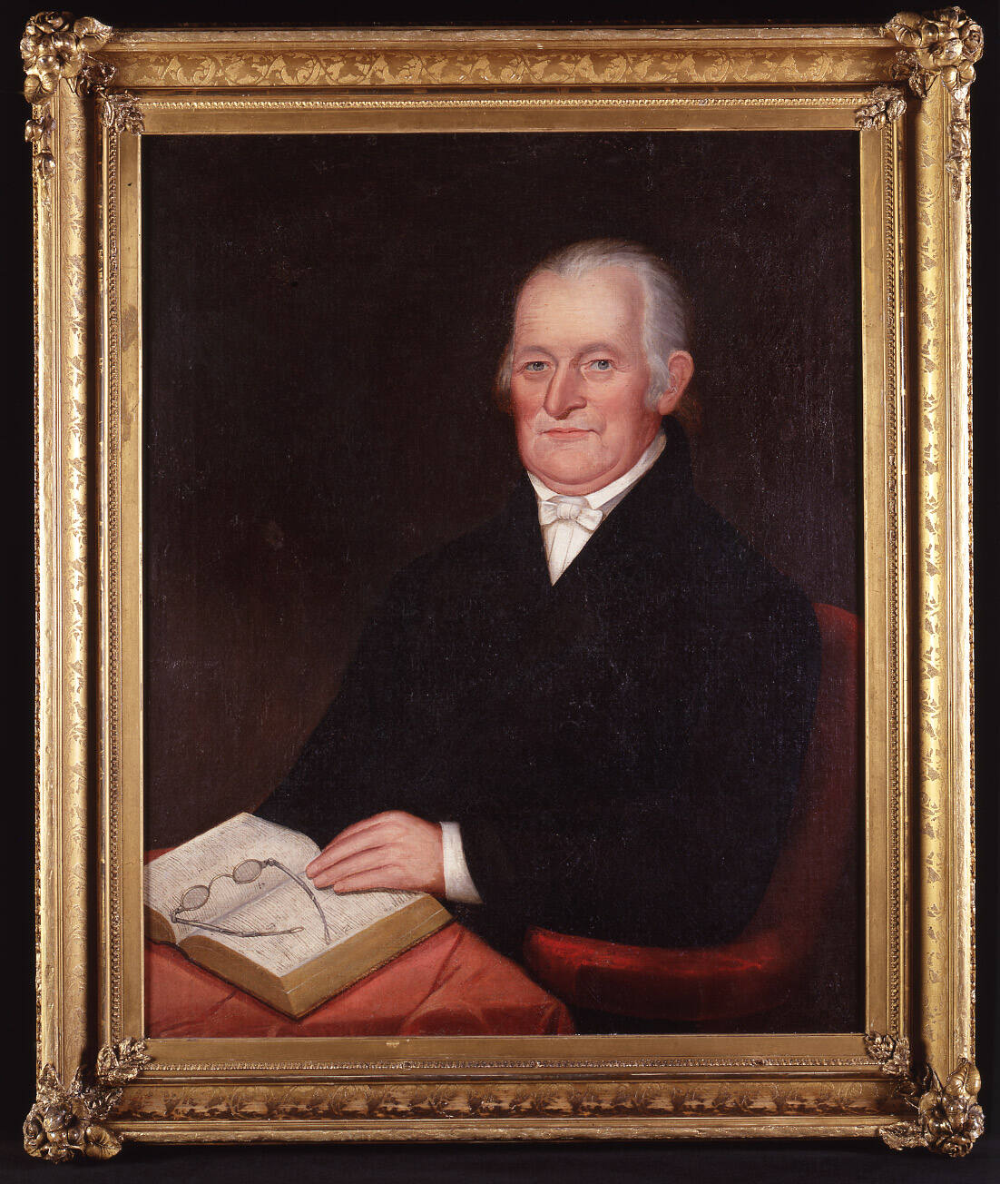 This portrait illustrates the combination of technical skill and naivete that marks much of Chandler's early work. The subtle shading and coloring of Dr. Goodhue's face and the competent treatment of the eyeglasses and book are evidence of an accomplished hand, although the sitter's pose and the position of his left arm appear stiff. As in many of Chandler's portraits of adults the palette is dark and somber, and the composition heavy.