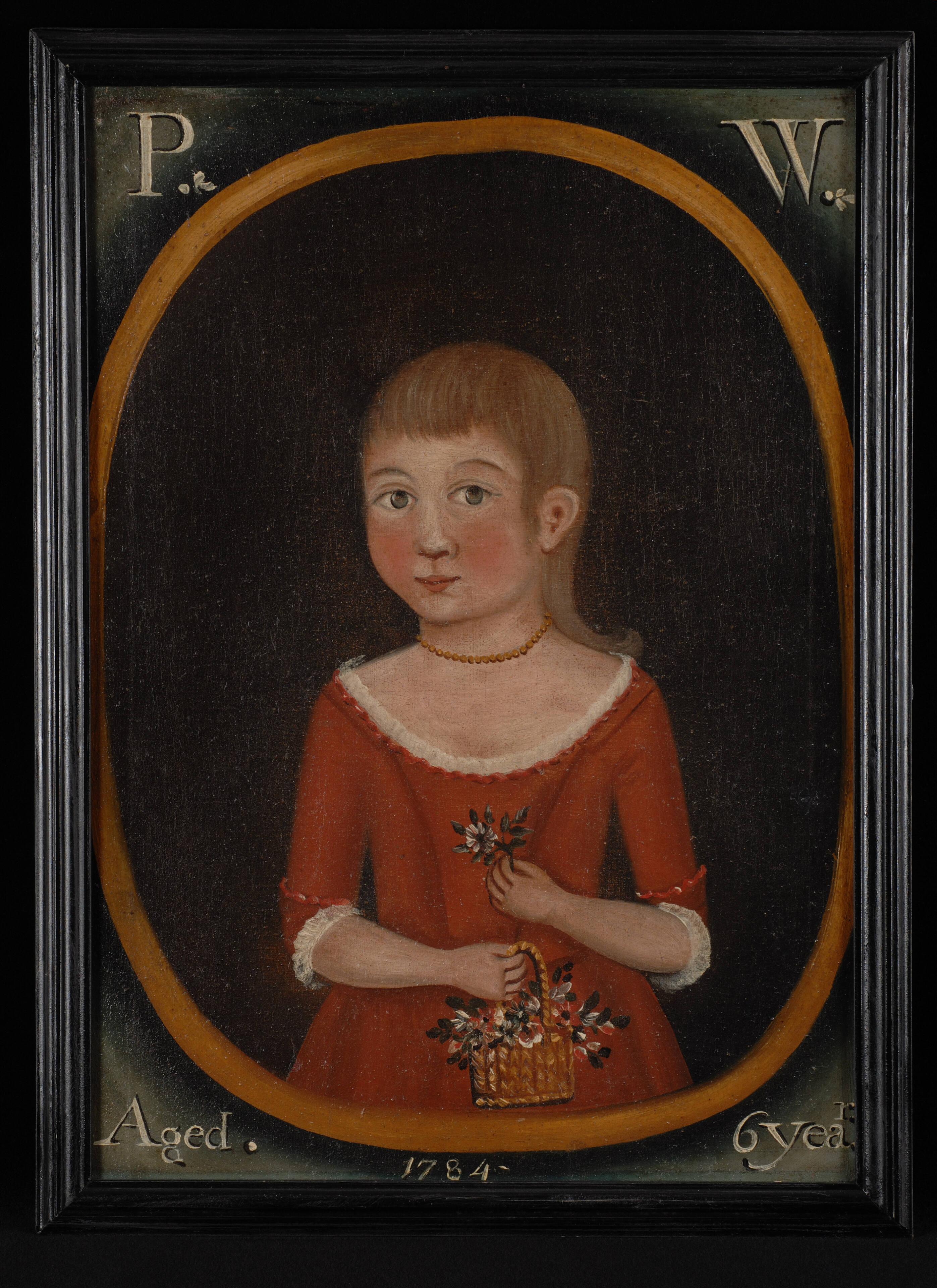 Label TextThis painting is one of four known portraits by this unidentified artist, all of which are composed within an oval with each sitter holding a personalized object, in this case a basket of wildflowers. The style of the inscriptions identifying the sitters’ initials, age, and the date of the paintings have led to speculation that the artist was a sign painter. Priscilla’s portrait, along with that of her brother Jonathan, descended in the family until they were separated probably in the early 20th century. Jonathan’s likeness was found in Maine in 1950 and given to the Museum in 1961. When descendants gave the portrait of Priscilla Wharff to the Fenimore Art Museum in 1990, the siblings were reunited. Born in 1778 and 1781 respectively, Priscilla and Jonathan may not have realized that they were born in a war-torn country whose ultimate fate was still in the balance.Exhibition History“American Folk Art: Collection from the Fenimore Art Museum,” Mona Bismarck Foundation, Paris, France, January 25, 2001 – March 24, 2001.