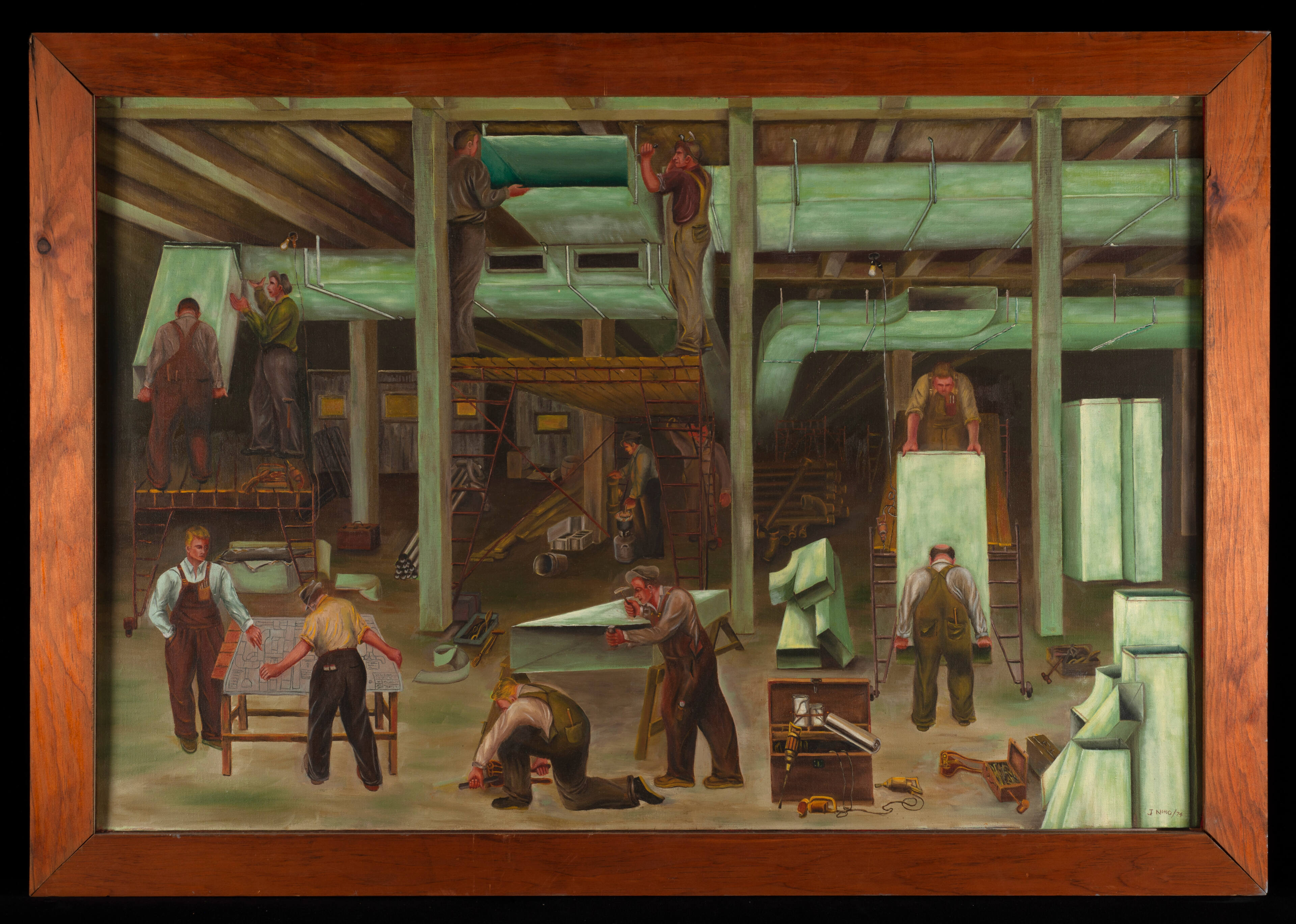 The sheet metal workers are installing air conditioning duct work constructed of galvanized iron. The young man on the left side of the picture is pointing out a mistake on the plan to the foreman, which has caused a considerable loss of time due to having to trim and alter the fitting by hand. A few more of such mistakes will prompt the foreman to call the shop and notify the boss of lost time rectifying mistakes made by the draftsmen on the plan. This complaint will cause the foreman to recommend that the draftsmen be laid off. However if the draftsmen are relatives of the boss or a drinking buddy of the foreman then the foreman will cover up for the draftsmen and say nothing about any mistakes. This is still the facts of life today on building construction.
