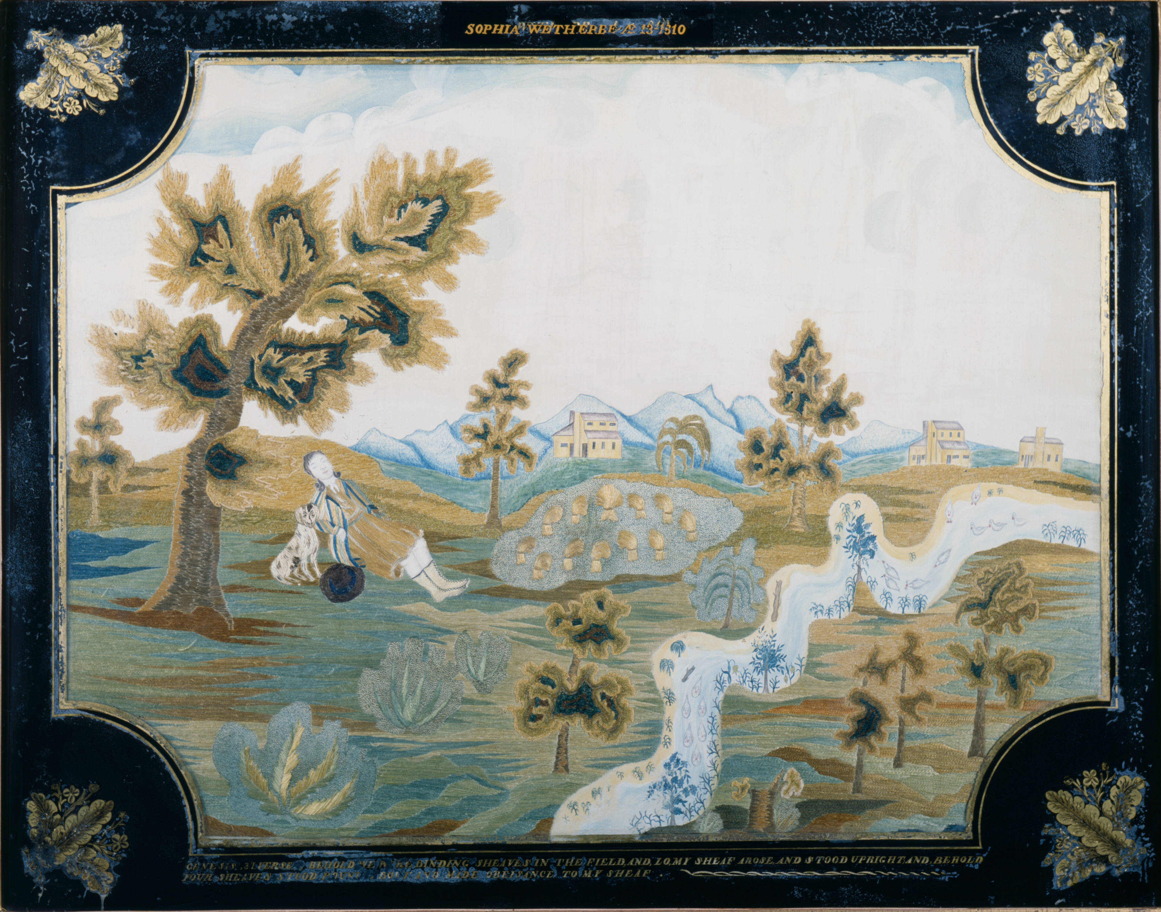 At age 13, Sophia Witherbe completed this needlework picture as part of her training at an all-female academy. Religious scenes, such as this of Joseph dreaming near a stream, were typical in schoolgirl art. These types of subjects reinforced religious education, while the needlework practice prepared girls for more 'practical' applications of the craft in the home.