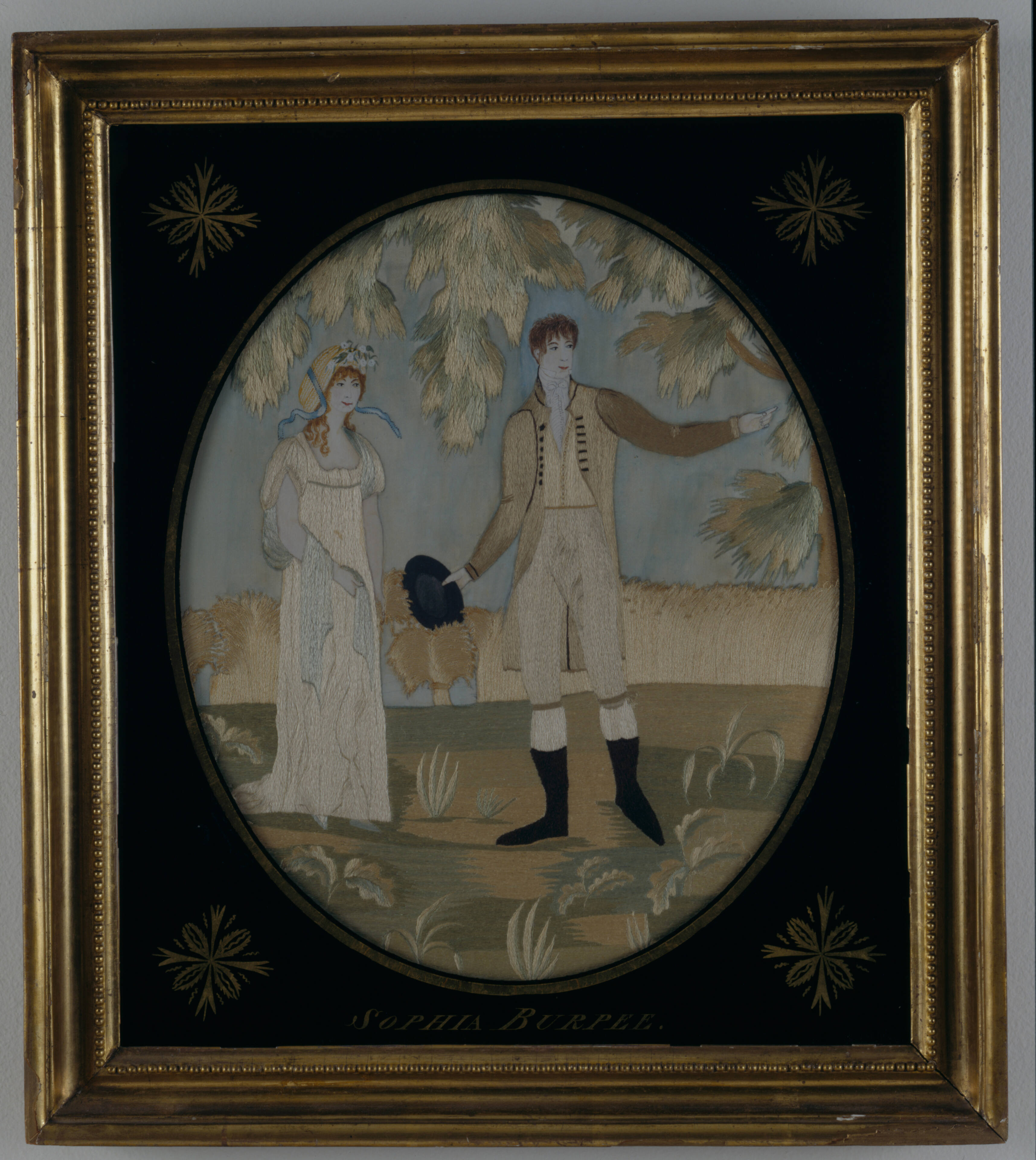 Label TextLittle is known about Sophia Burpee, except that she was married in 1813 and died the following year, possibly of typhoid fever, at the age of 26. She is the subject of an oil portrait in the collection of the National Gallery of Art, Washington, D.C., and the artist of several watercolors and this silk embroidery probably completed at school. This scene is taken from a print illustrating James Thomson's poem Autumn, published in London in 1730, and shows the moment described in the poem when Palemon recognizes that Lavinia, a gleaner in his field, is the long-sought daughter of his friend, Acasto. Young ladies such as Burpee, who learned their needlework skills in finishing schools, often had access to libraries of illustrated French and English literary works.