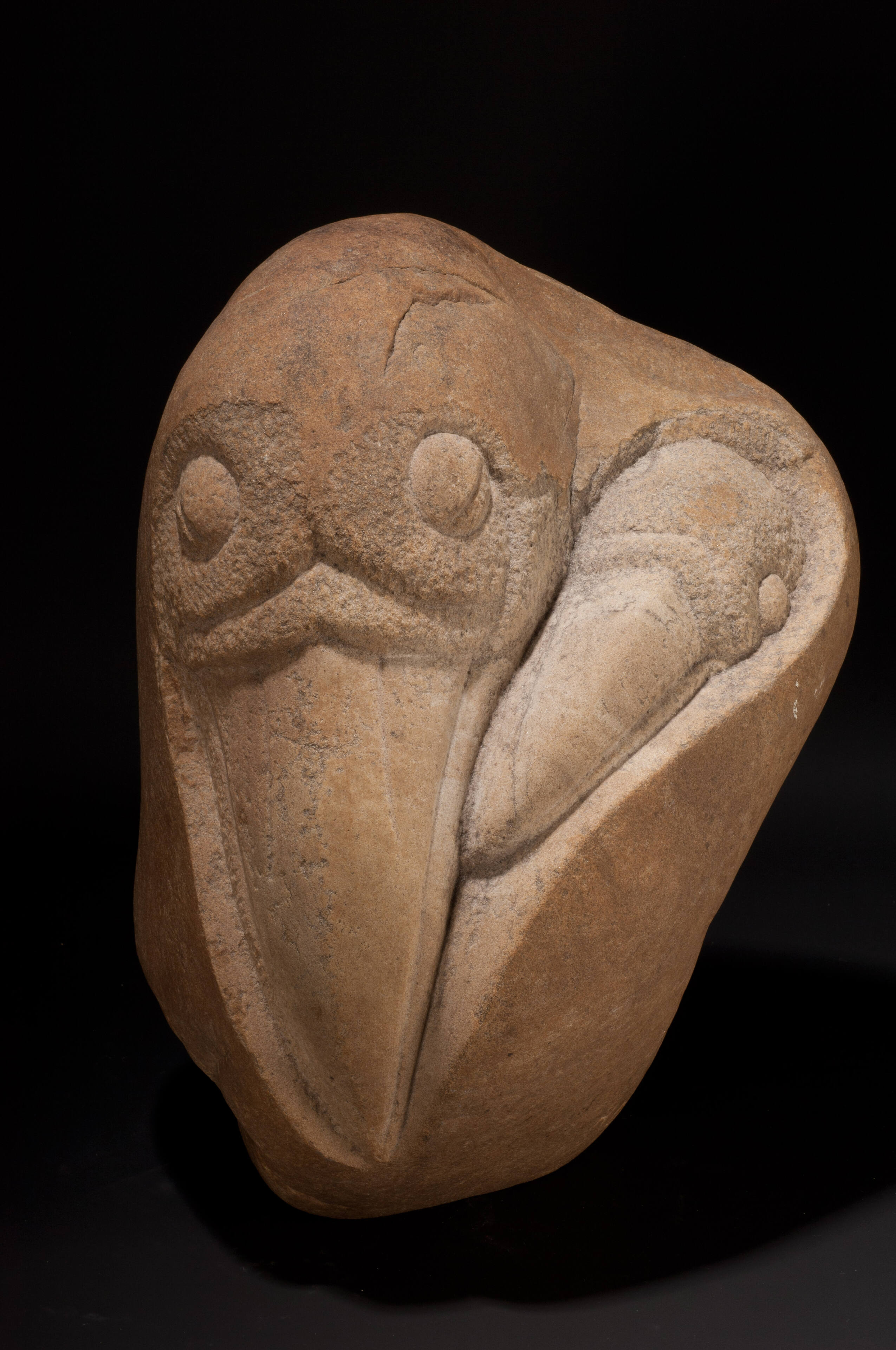Label TextIn Heart, DiSpirito captures the essence of maternal affection in the protective embrace of the mother bird on her baby. The two heads together form the shape of a heart and follow the original contours of the stone.On View