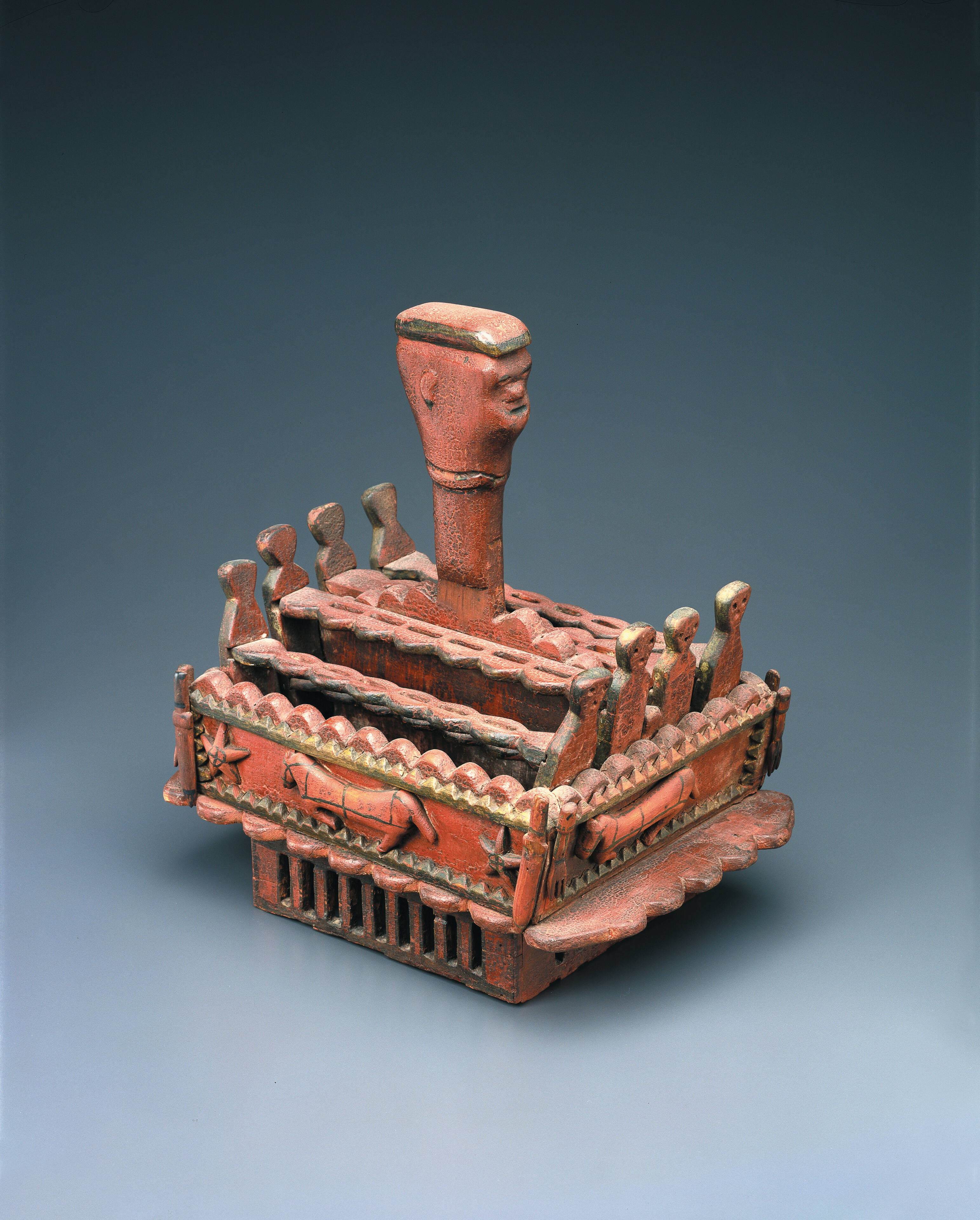 Label TextAfrican Americans expressed their identity through the creation of decorative objects as well as through depictions of self. This knife box, designed to hold cutlery, was crafted in the shape of a ship. Around the deck the artist placed rows of people, much like the tight rows on a slave ship. The bold, squared motifs on the box indicate that the carver was African American or perhaps was a person born in west Africa who remembered the crafts of his homeland. His people are straight and prominent. Below deck are vertical slits, much like iron bars. The box tells a story of the movement of people and of cultural identity. The maker identifies with the cultural traditions of African culture while creating a functional form based in European culture.Exhibition History"Dimensions of Black," La Jolla Museum of Art, La Jolla, CA, February 14, 1970 - March 29, 1970.