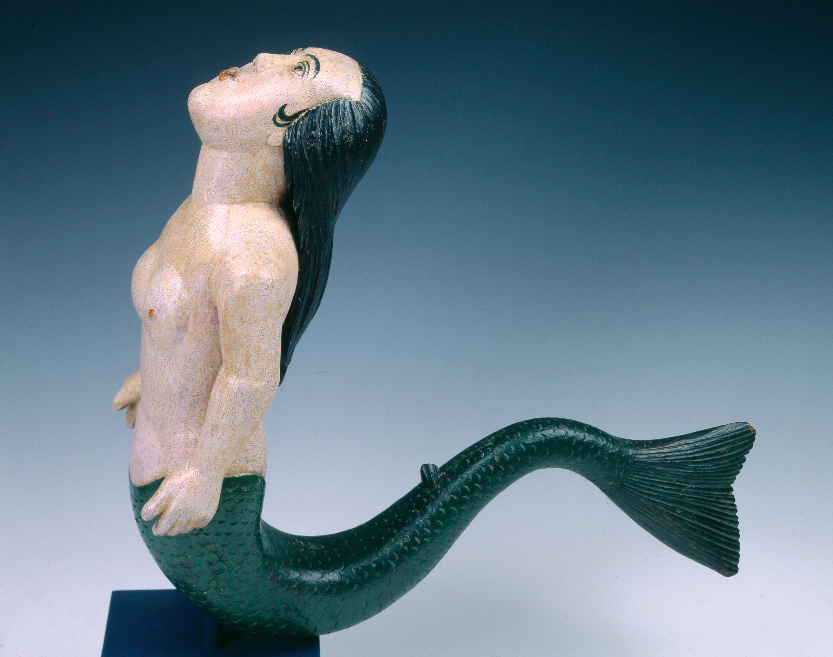 Label TextMermaids were popular subjects for signs, weathervanes, and carvings in coastal towns and cities. This sculpture, found in a waterfront shop in Baltimore, was possibly meant to be a garden fountain, although its condition suggests little actual use. It may have been a model for a fountain to be made of more durable material. The quality and style of carving strongly suggest the work of a professional woodcarver, possibly a shipcarver.Exhibition History“American Folk Art: Collection from the Fenimore Art Museum,” Mona Bismarck Foundation, Paris, France, January 25, 2001 – March 24, 2001.