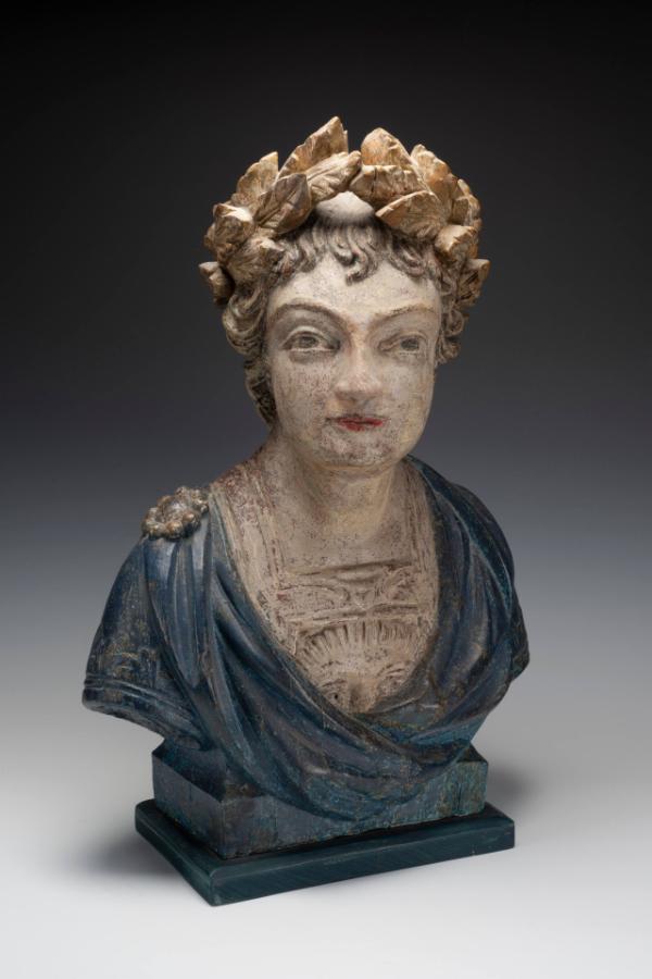 Label TextSimeon Skillen, Jr. was the foremost Boston ship carver of his day. Coming from a large family of ship carvers in Boston, Massachusetts, Skillen was regularly hired to carve ship figureheads and shop signs, architectural garden sculptures and ornamental sculpture for furniture. Apollo, the Greek god of music, poetry, prophecy, and medicine, probably served as a library ornament for someone well-versed in classical antiquity.Exhibition History“American Folk Art: Collection from the Fenimore Art Museum,” Mona Bismarck Foundation, Paris, France, January 25, 2001 – March 24, 2001.