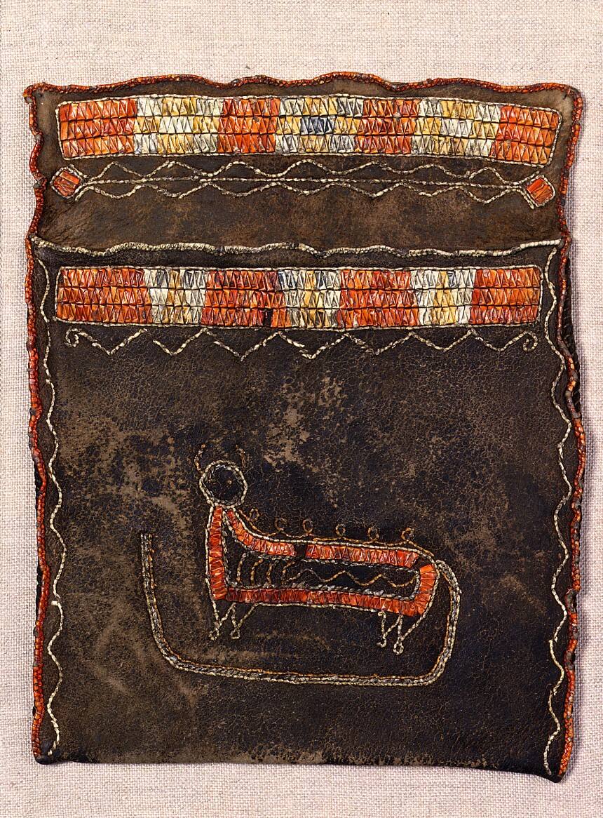 Label TextPouches of this type were originally worn on a man's chest by means of a neckstrap attached to the part that extends above the opening of the pouch. Like many surviving pouches, this pouch's original fringe of red-dyed hair tassels in metal cones to the bottom edge has been lost. The size and shape of these pouches are remarkably uniform despite their long-term and widespread use by Ottawa, Ojibwa, and other tribes of the Great Lakes from at least 1760 until the 1820s. A ritual function of these black pouches is strongly suggested by the patterns of their quill-worked decoration which represent either thunderbirds, horned underwater panthers, or semi-abstract references to snakes. Thus, it seems that the pouch owner put his trust either in the powers of the Sky realm or in those of the Underworld. Both of these cosmic realms could bestow special blessings, or cause misfortune if not approached in the correct ritual manner. In these pouches were carried charms relating to hunting, as well as pipes and tobacco, for both charms and tobacco smoke played a role in the cultivation of a beneficial relationship with the spirits of the wild animals. While occupied with such ritual preparations for the hunt, the owner placed the pouch in front of him like an icon.However, the standard size and shape of these pouches suggest an additional function beyond private devotions. Uniform character and wide distribution indicate their use in a cult or religious organization. (c.f. Brasser 1976, p.97; Phillips 1984, p.78; Penney 1989, p.10) The symbols on these pouches suggest that the members of this cult were divided into two divisions that stood in a ritual opposition to each other. The dualistic relationship between these two groups follows from their association with major representatives of the Sky and Underworld. Research focused on these pouches and related artifacts has produced a growing body of evidence that these objects belonged to the ceremonial outfit of an early version of the Midewiwin or Grand Medicine Society, referred to as the Black Dance in the early days of the fur trade. The focus of this cult's ceremonies shifted from honoring game spirits to the curing of disease after the fur trade moved west and the Great Lakes Indians were left to face the disintegration of their society as a result of expanding white settlement. (From the Catalog of the Thaw Collection of American Indian Art, 2nd ed.)