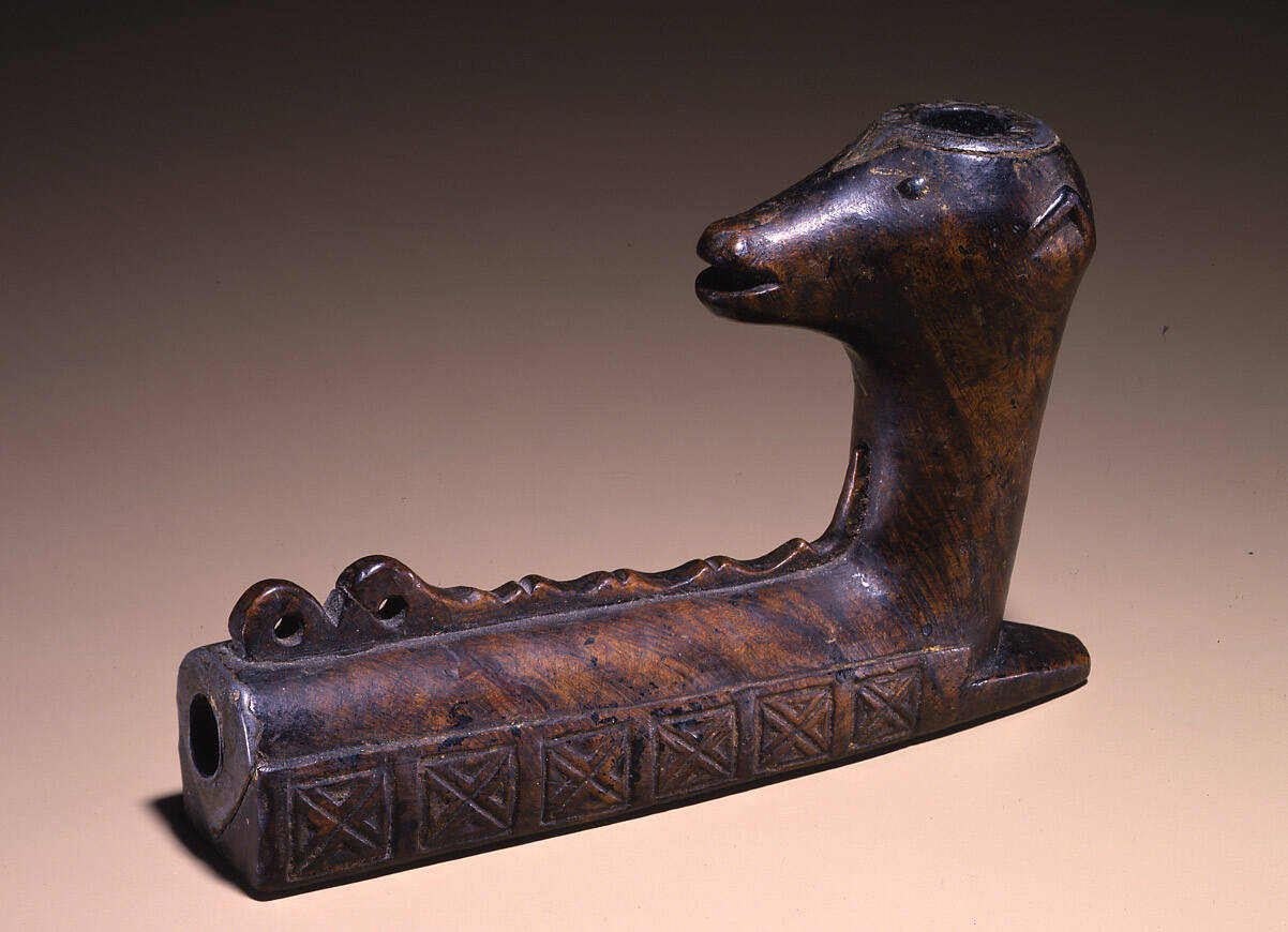 Label TextThis effigy of a bear's head on a pipe bowl is delicately rendered in its stylized carving. The effigy directly faces the smoker and likely represents a guardian spirit. Pipe smoking allowed the smoker to reflect up on his guardian spirit and this physical orientation of the effigy facilitated meditation.Exhibition History"Art Des Indiens D'Amerique Du Nord Dans La Collection D'Eugene Thaw," Mona Bismarck Foundation, Paris, France, Somogy Editions D'Art, January 21, 2000 - March 18, 2000.