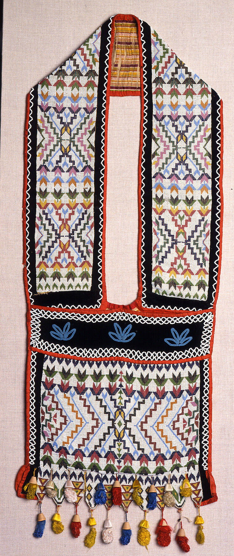 Label TextThe loomwoven beadwork on this bag and its shoulderstrap is a more elaborate version of the basic X motif that was popular on many of the earlier examples of Southwestern Ojibwa origin. The rather narrow panel of black velvet above the bag itself appears to be more characteristic for bandolier bags attributed to the Potawatomi and Menomini of Wisconsin, and so is the border of small and open white diamonds. The silk tassels on wooden cones are unusual and probably purchased ready-made from an upholstery shop.A brisk intertribal trade, give-aways, and undocumented collecting of most of these bandolier bags impede the identification of the various distinct styles. Despite the large number of these bags each of them is unique in its decoration, presenting evidence of the great skill and impressive imagination of the women who made them. (c.f. Maurer 1977, p.114, fig.108; Anderson and Hussey-Arnston 1986, p.65, fig.12). During the second half of the 19th century the time-consuming production of these colorful showpieces must have been a veritable cottage industry, undoubtedly stimulated by the demand from more western Indians, but also by the intense pre-occupation of the producing communities with ceremonial activities in those early years of reservation life. Indicative of wealth and social standing, bandolier bags were often worn in pairs by their owner, their straps crossing the chest. (From the Catalog of the Thaw Collection of American Indian Art, 2nd ed.)