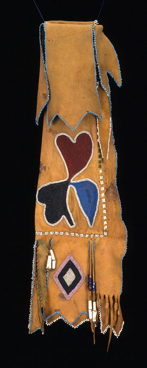 Label TextThe shapes of skin bags changed with the introduction of scissors and steel knives, but they often retained a reference to the shape of an animal. The softly tanned hide of this bag was beaded with curvilinear, almost abstract flowers, and reflected the infusion of new highly stylized designs. A new intertribal art style emerged among the Native people that were forced to move to reservations in Oklahoma and Kansas. This bag reflected the efforts to revitalize a Native identity during a period of profound change.Provenance Alexander Gallery, New York; Morning Star Gallery, Santa Fe, New Mexico