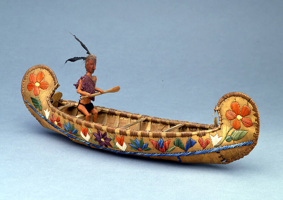 The Cree and Ojibwa quilled floral sprigs on the sides of canoe models up to the 1930s, but never better than this mid-19th century example. An earlier canoe model (c. 1760) without the pronounced prows seen here, but with sail and holding a family of five, still exists (cf. Phillips 1987, p. 54, W77). The high prowed type later became the western Great Lakes long-nosed canoe; while the low-prowed canoe type became the Wabanaki Chimen canoe of the Eastern Great Lakes. Mary Kooyik, presumably the maker of this canoe, wrote the Native rendition of her name on the bottom: Mani Kueyik. (From the Catalog of the Thaw Collection of American Indian Art, 2nd ed.)