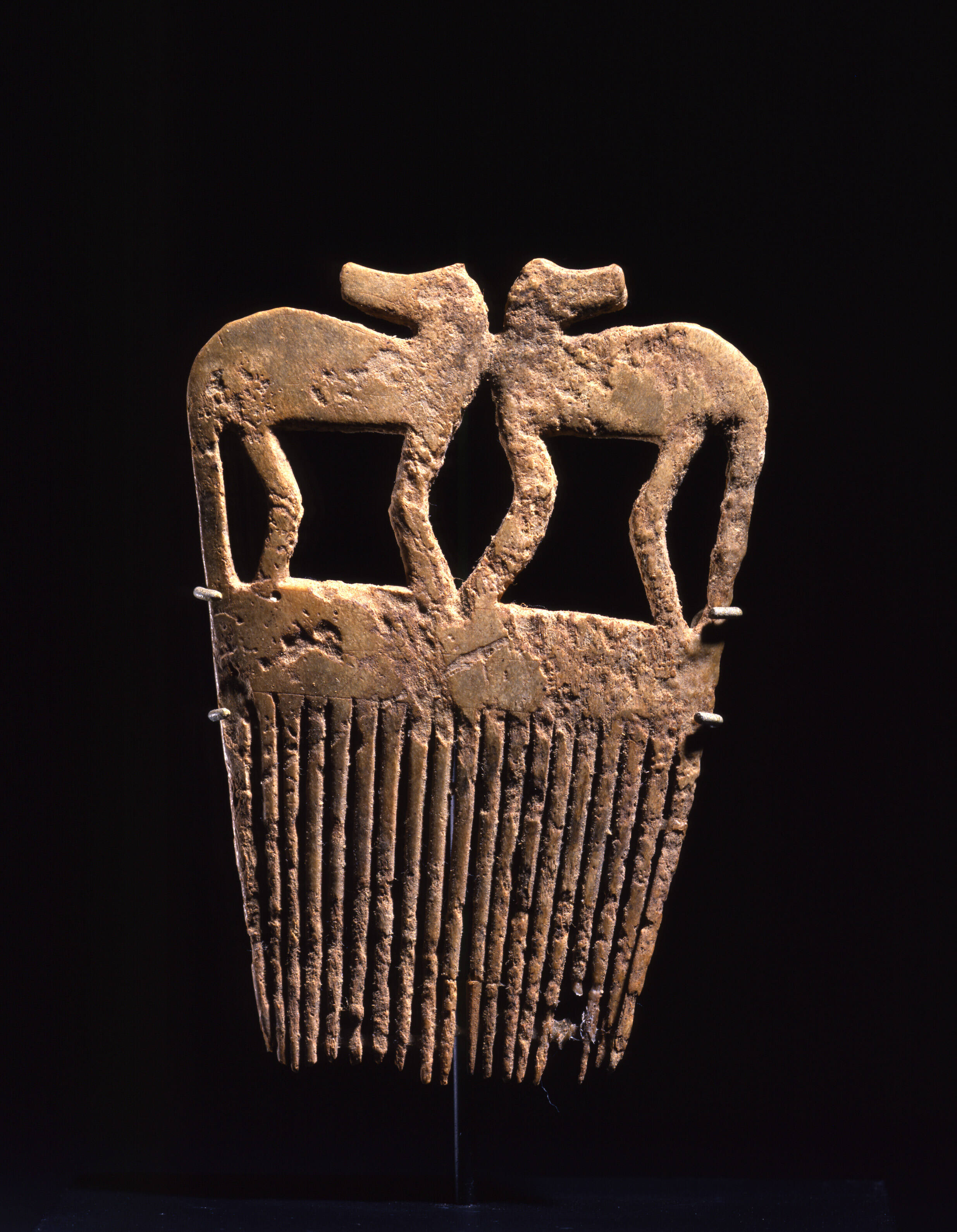 Label TextSince late pre-contact times the Haudenosaunee (Iroquois) have carved effigy-decorated combs from wood, bone, and antler. After acquiring metal tools in the 17th century, the carvings and engravings on these combs became more elaborate with finely cut teeth, particularly among the Haudenosaunee nations of Seneca and Cayuga. (c.f. Wray 1963, pp. 38-39, pl.1, fig.6; Lyford 1945, p. 23, pl.15). Some 275 of such combs have been recovered from Seneca sites. However, as very similar effigy combs were made as well by the Neutral, Erie, and Susquehanna, some of the combs found in Seneca country may have belonged to captives following the defeat and subjugation of these neighboring tribes by the Seneca. The carving of these combs reached its peak in development between 1650 and 1700, after which they slowly went out of fashion.These combs are rectangular, with the upper part carved in the shape of a human animal, or bird. The image of the single horse may relate to the first appearance of European horses in Seneca country in the late 1600s.Two other combs show the conventional theme of two identical animals opposite each other, but it is most unusual that these animals have their faces turned away from each other. Combs were worn by both men and women, and by children. Apart from their utilitarian function, they served as hair ornament. (From the Catalog of the Thaw Collection of American Indian Art, 2nd ed.)