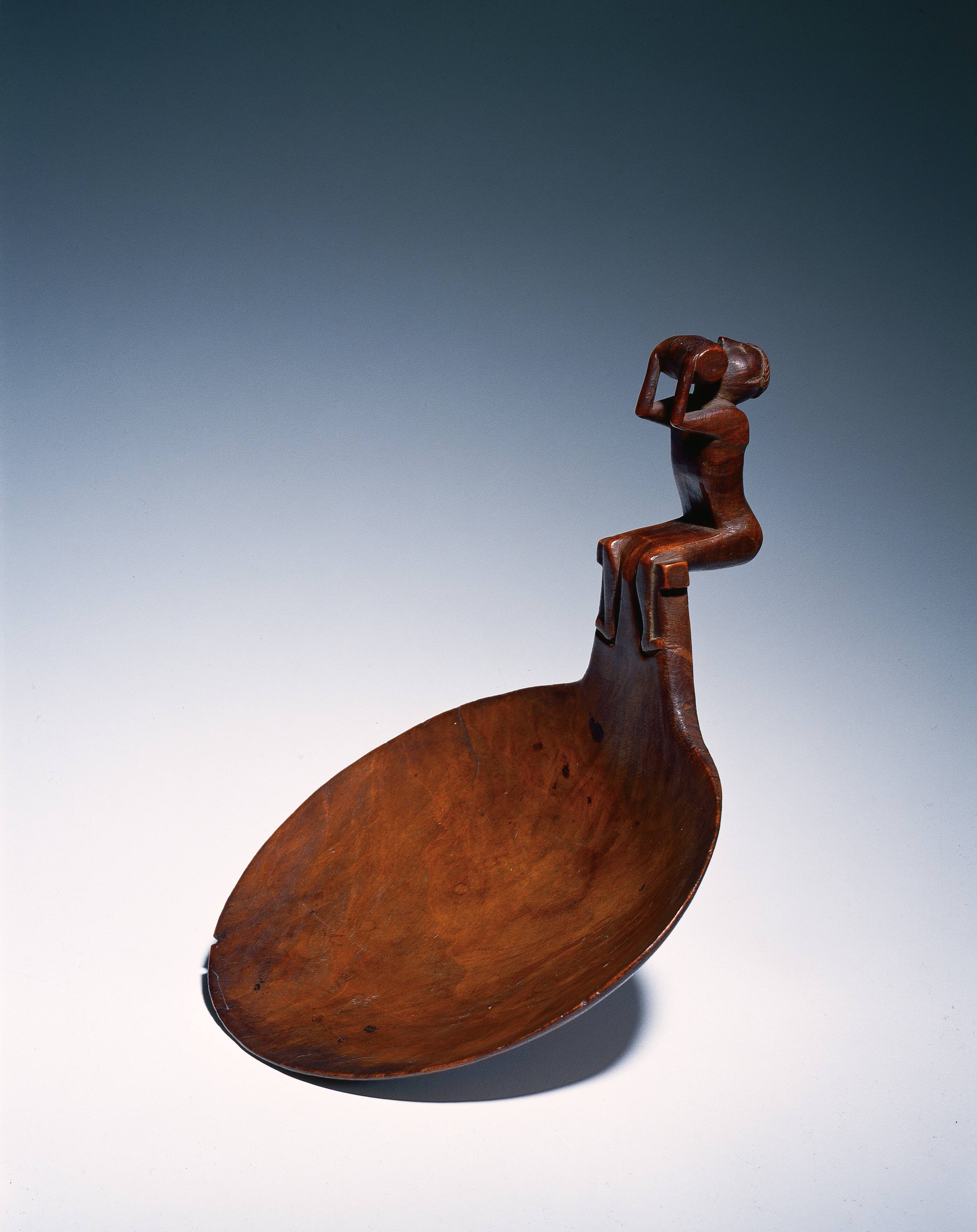 Label TextThe human figure, holding up a rum keg while sitting atop the short handle, is a magnificent example of Wyandot effigy carving in the mid-18th century. After the defeat of the Wendat (Huron) by the Haudenosaunee in 1649, many refugees fled west, to wander in the region of the upper Great Lakes. They came to be known as the Wyandot, a corruption of Wendat, the name used by the Wendat for themselves. In 1702, the Wyandot settled in the Detroit area, expanding into northern Ohio soon after. The theme of drinking from a keg is known from an effigy pipe bowl in the British Museum, at least two effigy pipe bowls of documented Wyandot origin in the National Museum of the American Indian, a wooden effigy pipe bowl in the collection of the Donald D. Jones in Kansas city, and from a surprisingly similar effigy ladle attributed to the Mohawk in the Philbrook Museum of Art (cf. Dockstader 1962, figs. 237 and 240; King 1977, p. 20, no. 37, p. 36, p. 50, pl. 13; Wade 1986, p. 165, fig.143). The last was apparently acquired among the population of Wyandot and Haudenosaunee peoples in the northeastern part of Oklahoma. The rum keg in these effigies probably refers to the role of rum consumption in the annual ceremonies of the White Panther cult among the Wyandot. The shamanistic cult was devoted to the worship of Ontarraoura, the giant pantherlike dragon ruler of the Underworld. The ceremonial use of rum provided its members with visionary experiences. (From the Catalog of the Thaw Collection of American Indian Art, 2nd ed.)Exhibition History"Art Des Indiens D'Amerique Du Nord Dans La Collection D'Eugene Thaw," Mona Bismarck Foundation, Paris, France, Somogy Editions D'Art, January 21, 2000 - March 18, 2000.