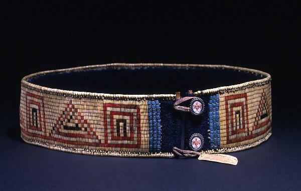 This is a very beautiful example of the loom-woven quillwork produced about 1800 in the region of present-day Manitoba. (c.f. Brasser 1976, fig.76; Phillips 1984, fig.22; Sotheby's 1981, lot 23; Painter 1992, cat.no.121). Woven quillwork was formed on a bow-loom by inserting flattened quills between the warp threads and folding the quills over and under the weft thread. Typical for these belts are the use of early blue beads at the ends of the quillwork and the short wooden sticks sewn into the ends of the belt, presumably to prevent it from wrinkling. Two leather loops at one end fit around two enameled metal buttons of British origin in the neoclassical style. Although comparable quillwork appears to be of northern or western Ojibwa origin, confusion with similar quillwork decorating early shotpouches of the Cree in northern Manitoba has led to the mistaken assumption that all quillwork of this type was of northern Cree origin. The quillwork of this belt is red, blue (now faded), dark brown, and the off-white of the natural quills. Some of these antique belts have a backing of birchbark; in this case dark blue trade-cloth was used. (From the Catalog of the Thaw Collection of American Indian Art, 2nd ed.)Exhibition History"Art of This Land," National Gallery of Canada, Ottawa, Ontario, Canada, February 1, 2009 - April 1, 2011.