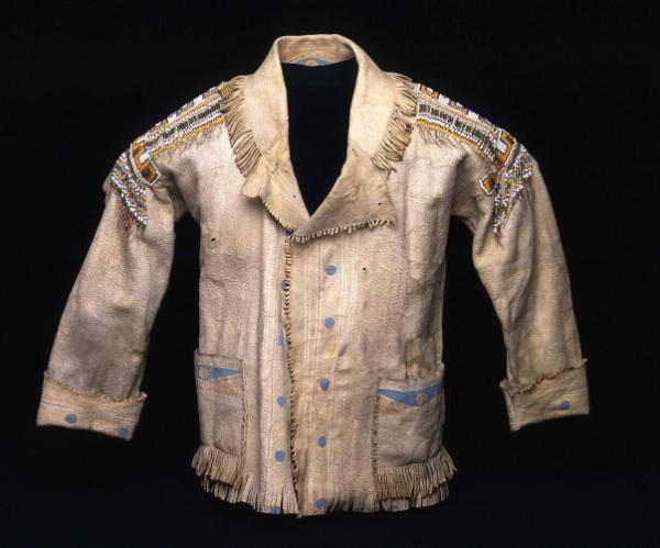 Label TextThe jacket combines red, yellow and blue painted geometric designs defined by parallel lines pressed into the skin and shoulder decorations of antique beads both woven and as bead-strung fringes. (c.f. Painter 1993, fig.213A; Krickeberg 1954, pl.17-a; Brasser 1976, p.54 & p.98). The restriction to the same colors in the painting and beadwork is certainly no coincidence, as the jacket was made from a longer coat that was cut down. Extra pieces of the lower portion were utilized for pockets, collar, and cuffs. Long coats of this type were made by the Cree peoples in Manitoba in the period of 1780-1820, though fur trade records mention them for the Cree as early as 1743. Their decoration is similar to this jacket with a T-shaped column of geometric designs painted on the back, geometric painting along the front opening and along the lower rim of the long coat and loom-woven quillwork or beadwork on the shoulders. The painting was done by means of sticks dipped in a mixture of pigment and grease. Long coats of this type were used in wintertime, worn over a coat of blanket material. Instead of buttons, a belt held the garment together. (From the Catalog of the Thaw Collection of American Indian Art, 2nd ed.)ProvenancePrivate collection, Scotland; Taylor A. Dale, Santa Fe, New Mexico
