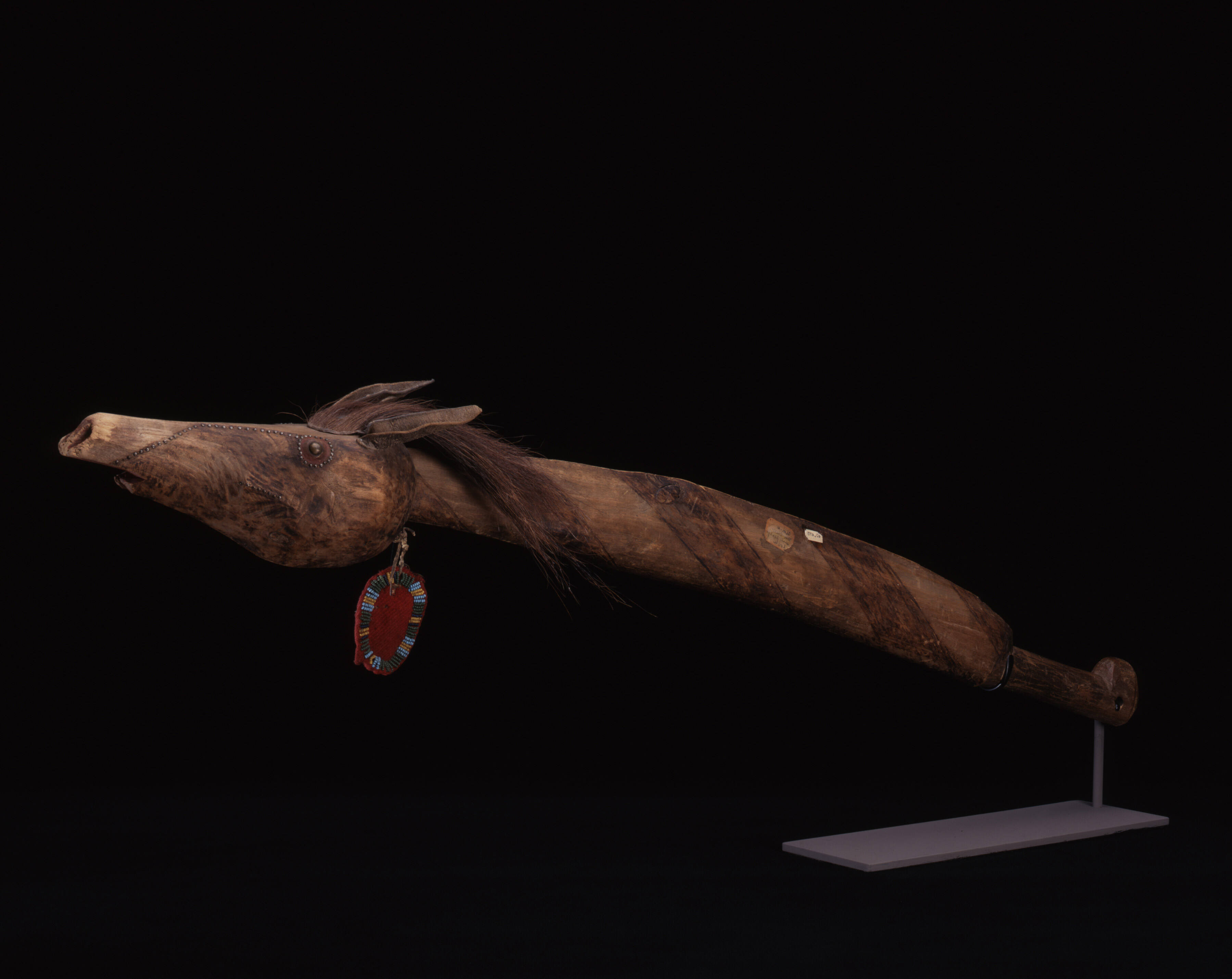Label TextOn the Plains, men used specially trained horses for many different difficult tasks. In order for the hunter to spear a buffalo, his horse had to come very close to the animal. During warfare, a horse had to be able to charge into a hail of bullets and overcome an enemy. A warrior’s life depended on his horse. When a special horse died, the owner paid respect to the animal with an effigy. During dances men carried horse dance sticks like this as memorials, to illustrate the important relationship between the warrior and his horse.Exhibition History"Treasures from the Thaw Collection," Wheelwright Museum of American Indian Art. Santa Fe, NM, May 1, 2000 - December 31, 2000.
