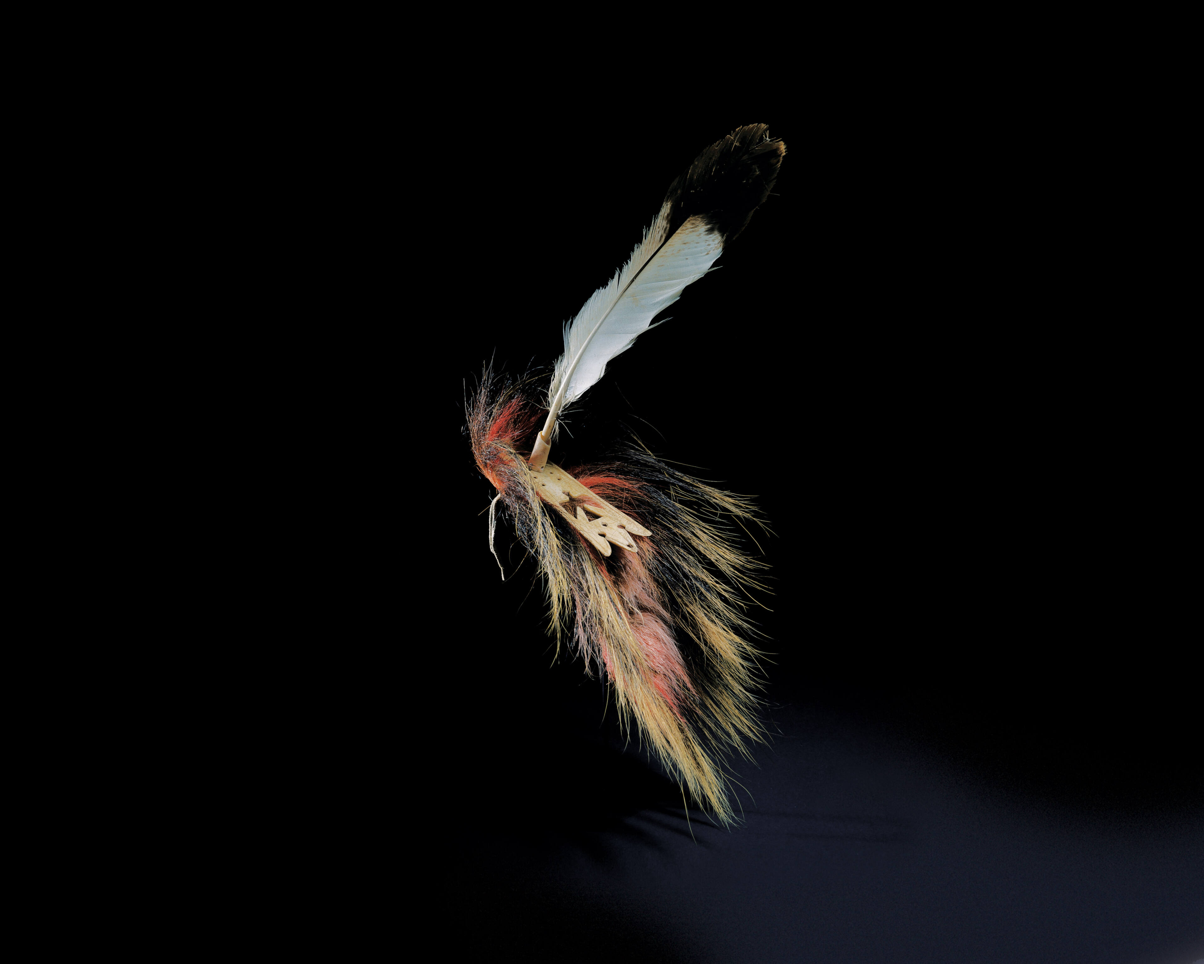 Label TextThe roach or decorative hairpiece was originally a warrior's headdress and was inspired by the pileated woodpecker whose crest stands up when it is "angry" and "attacks" the tree. Due to this interpretation of the bird's behavior, roaches became associated with the Thunderbird and warfare. In more recent times roaches were worn in the Grass Dance, and they are still a standard ingredient in the powwow regalia.The roach is composed of red-dyed deer hair and porcupine guard hair knotted around horsehair. When fitted over the crown of the head, the roach creates a cockscomb effect. The roach spreader, attached to the roach with thongs, holds an eagle feather in a socket. The arrangement of attachment holes in this spreader indicates it was made and used by people who no longer wore their hair long, as it lacks the large central hole through which the wearer's hair was drawn. The angled top of the feather socket points to an Upper Missouri River origin. Cutout bird figures do not show up on early 19th-century examples, and the only other known roach spreader with cutout bird figures is in the Hotz Collection in Zurich, Switzerland. It is of recent but apparently unknown origin. (From the Catalog of the Thaw Collection of American Indian Art, 2nd ed.)