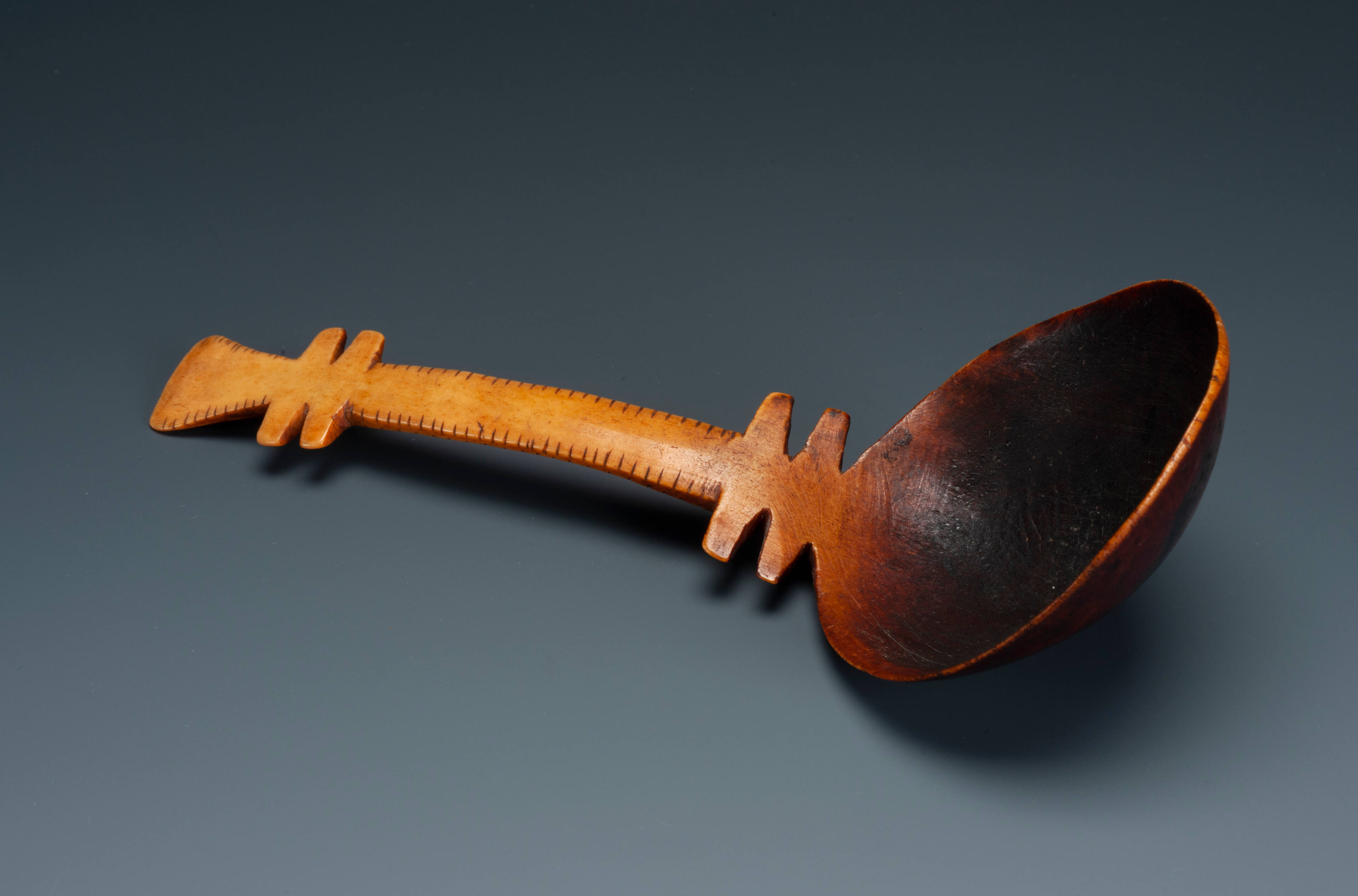 Label TextYurok, Hupa, and Karuk men used elegantly carved elk antler spoons to eat acorn soup at ceremonies and other important events. They made the spoons by cutting flat sections of antler and steaming them to make them flexible. Next, they cut out the spoon’s form and allowed them to harden. Finally, they fashioned abstract designs on the handle and smoothed the surface to an even finish.Exhibition History"Art of the American Indian: The Thaw Collection," The Cleveland Museum of Art, Cleveland, OH, March 2, 2010 - May 30, 2010; Minneapolis Museum of Art, Minneapolis, MN, October 24, 2010 - January 9, 2011; Dallas Museum of Art, Dallas, TX, April 24, 2011 - September 23, 2011; Indianapolis Museum of Art, Indianapolis, IN, December 4, 2011 - February 12, 2012.